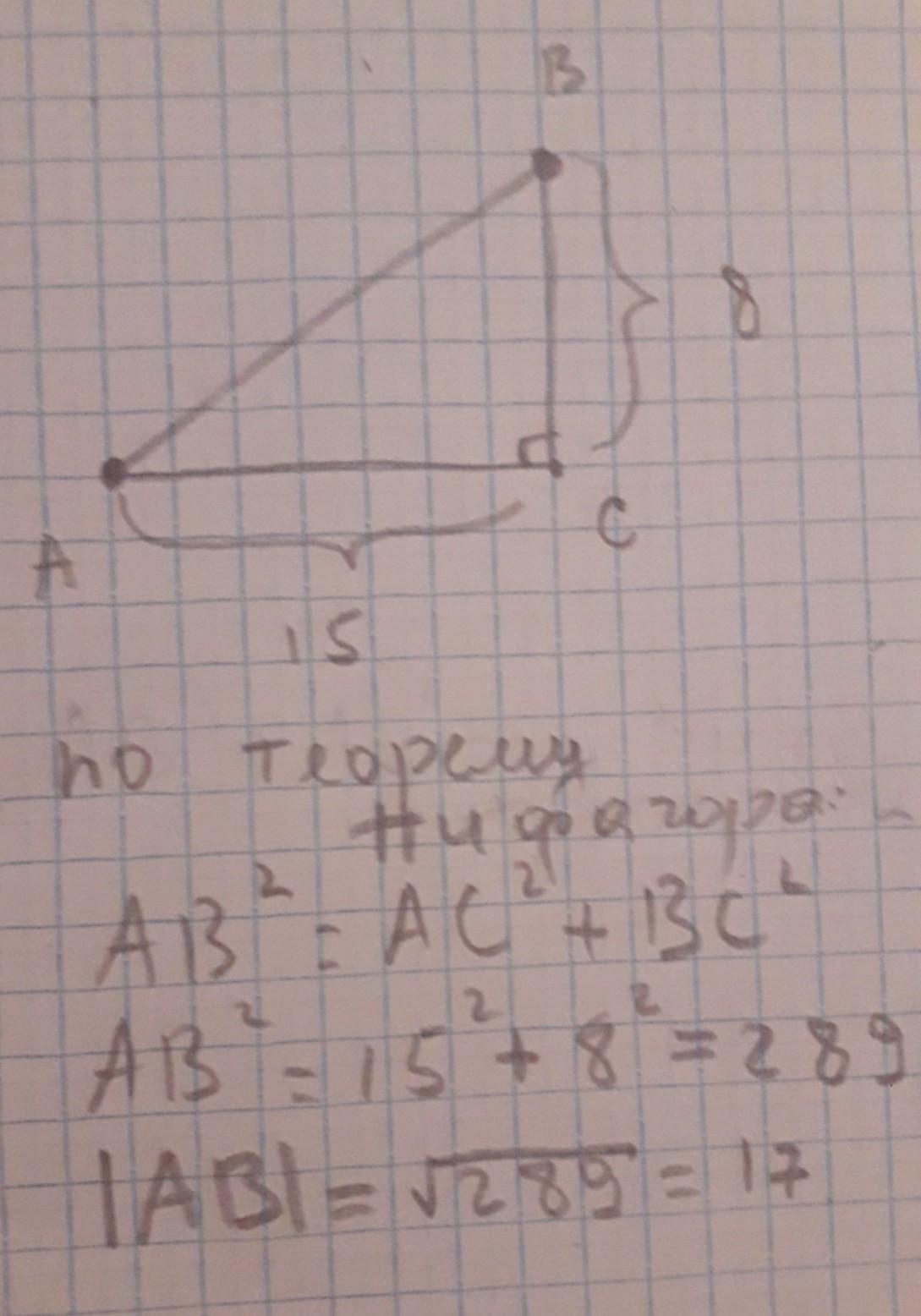 АВ^2=15^2+8^2=225+64=289 => |АВ|=17
