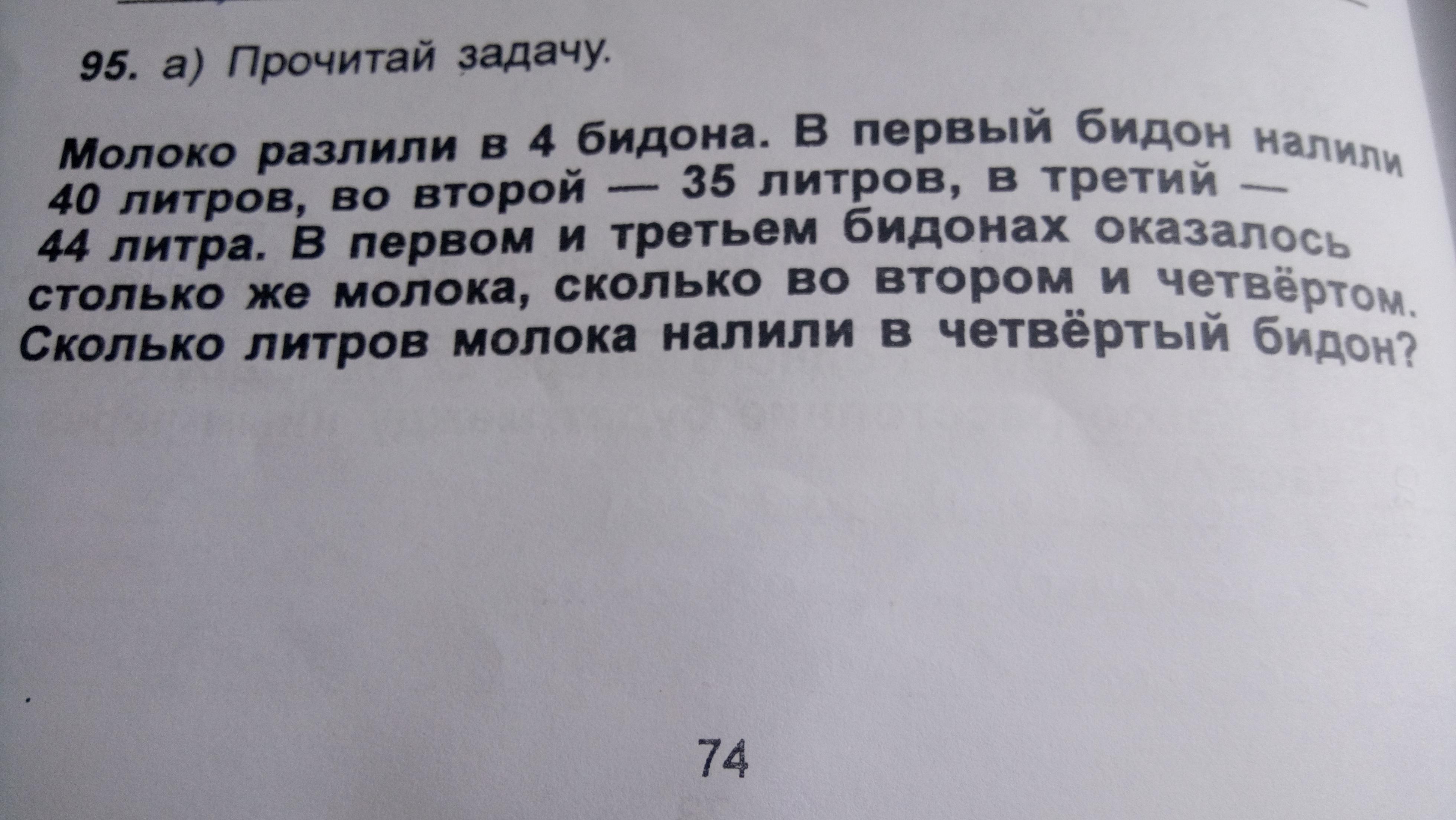 Молоко разлили в 4 бидона. В первый бидон налили 40 литров, во второй - 35 литров, в третий - 44 литра. В первом и третьем бидонах оказалось столько же молока, сколько во втором и четвертом. Сколько литров молока налили в четвертый бидон?