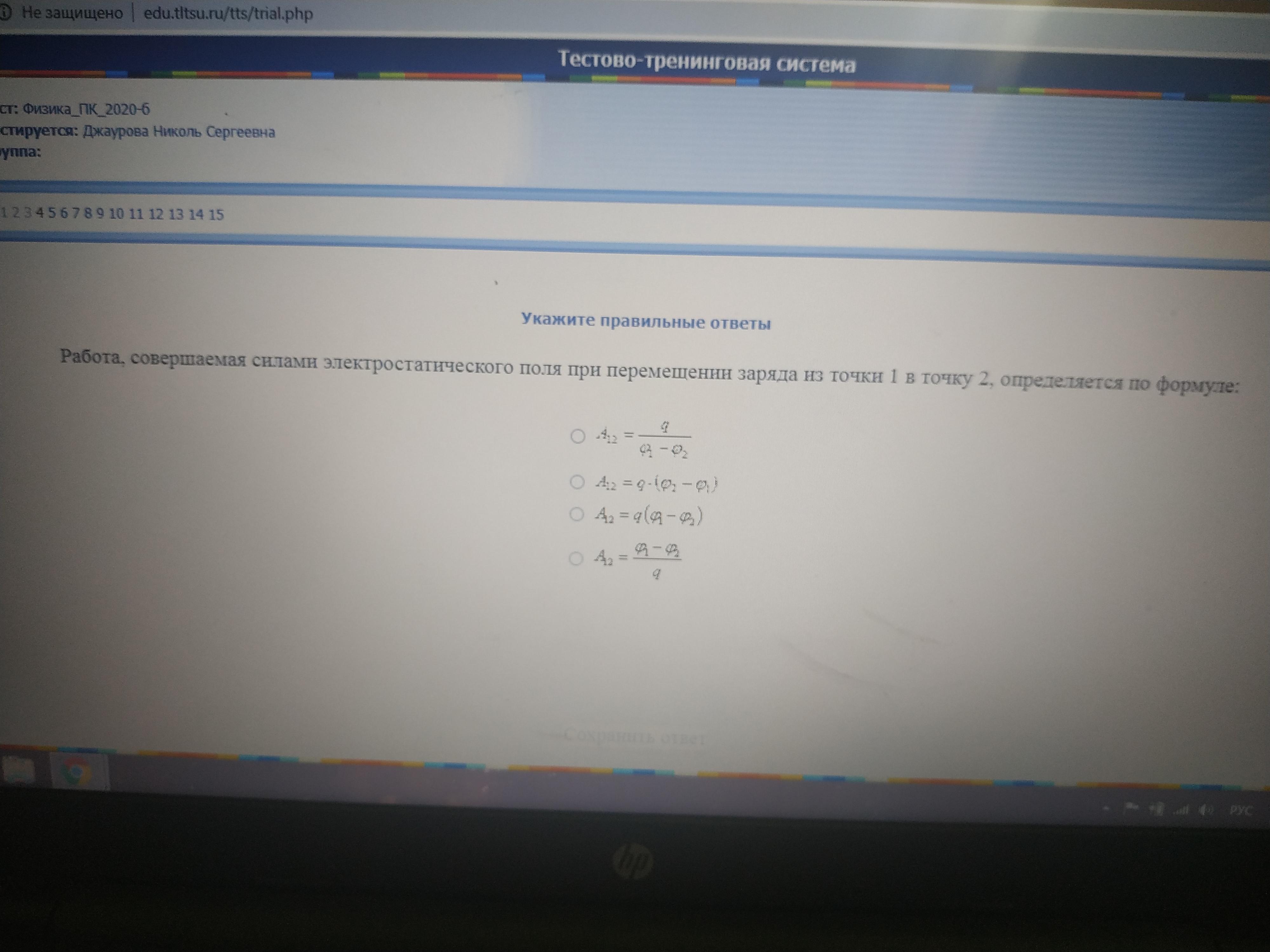 работа, совершаемая силами электростатического поля при перемещении заряда из точки 1 в точку 2, определяется по формуле.ПОМОГИТЕ СРОЧНО!!!!