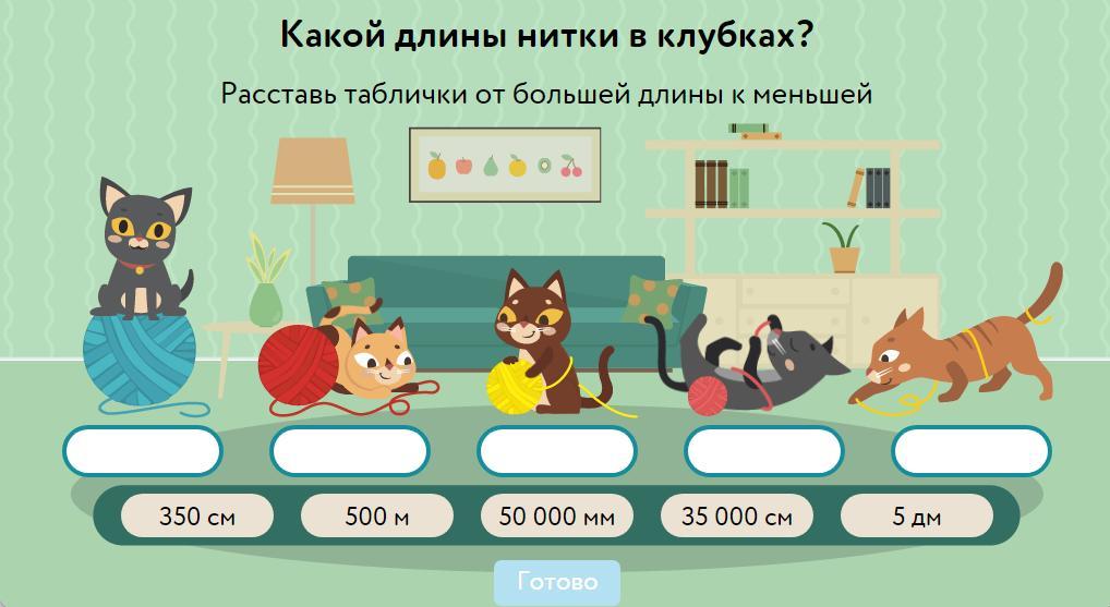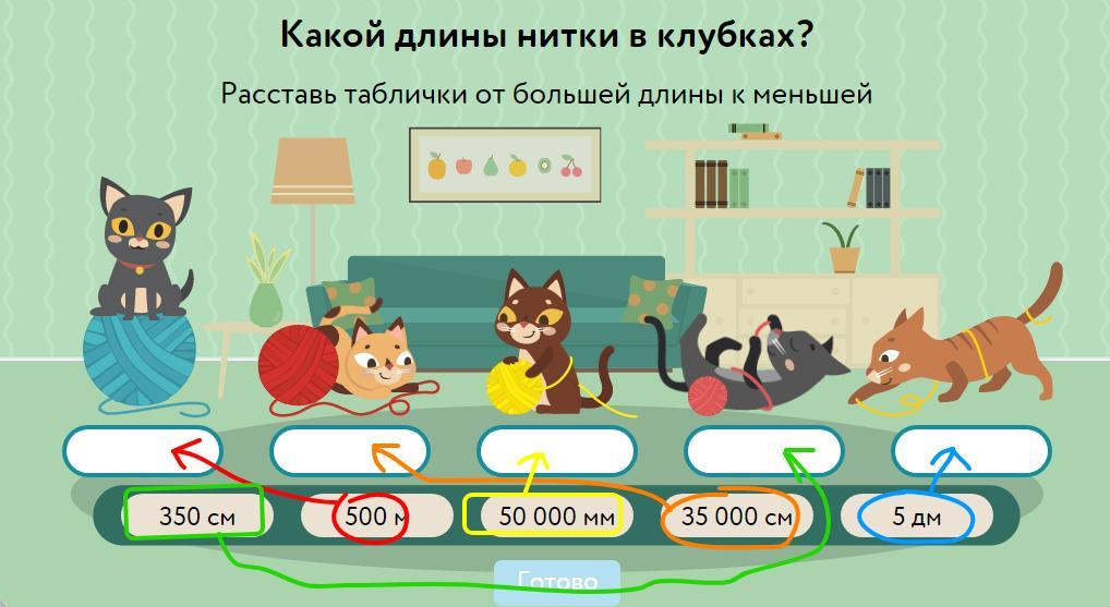 У первого кота 500м, у второго 35000см, у третьего 50000мм, у четвертого 350см, у пятого 5дм.