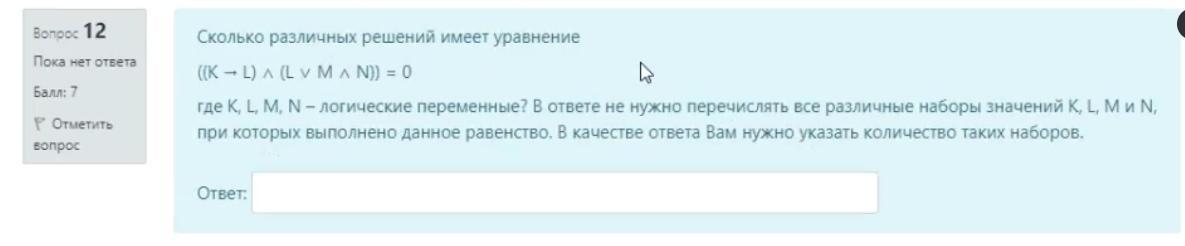 Пусть K = 1. Тогда K → L = 0, вторая скобка может давать любое значение. Подходят все возможные варианты M и N: 1000, 1001, 1010, 1011.