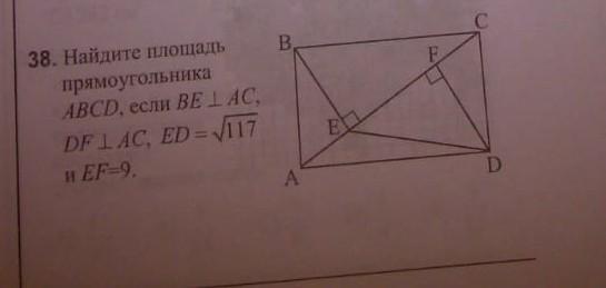Найдите площадь прямоугольника ABCD если BC перпендикулярно AC, DC перпендикулярна AC , BD равняется корень из 117,ЕF равняется 9