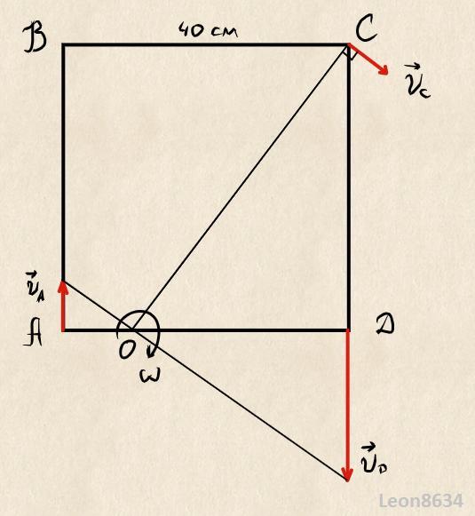 Квадрат ABCD, изготовленный из тонкого ровного листа твёрдого материала, скользит по ровной поверхности. В некоторый момент времени вершина A движется по направлению к вершине B, а вершина D движется от вершины C, причём отношение их скоростей vD/vA=3. В этот же момент времени величина скорости вершины C равна 0,5 м/с. Найдите величину угловой скорости вращения квадрата в этот момент времени. Длина стороны квадрата 40 см. Ответ выразите в рад/с, округлив до десятых.