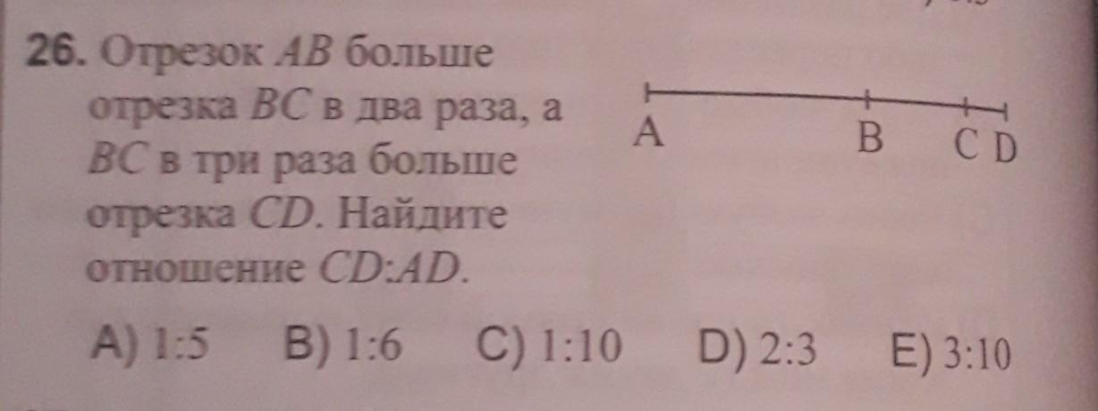 Пусть отрезок ВС=х, тогда АВ=2х. Так как ВС в 3 раза больше отрезка СD, то отрезок СD=x/3.