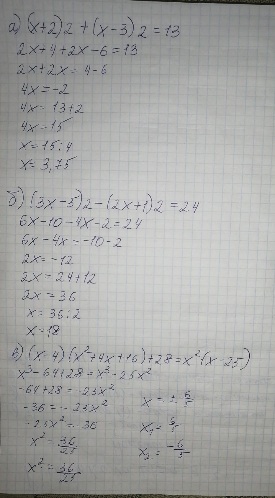 б) (3х – 5)2 – (2x + 1)2 = 24;