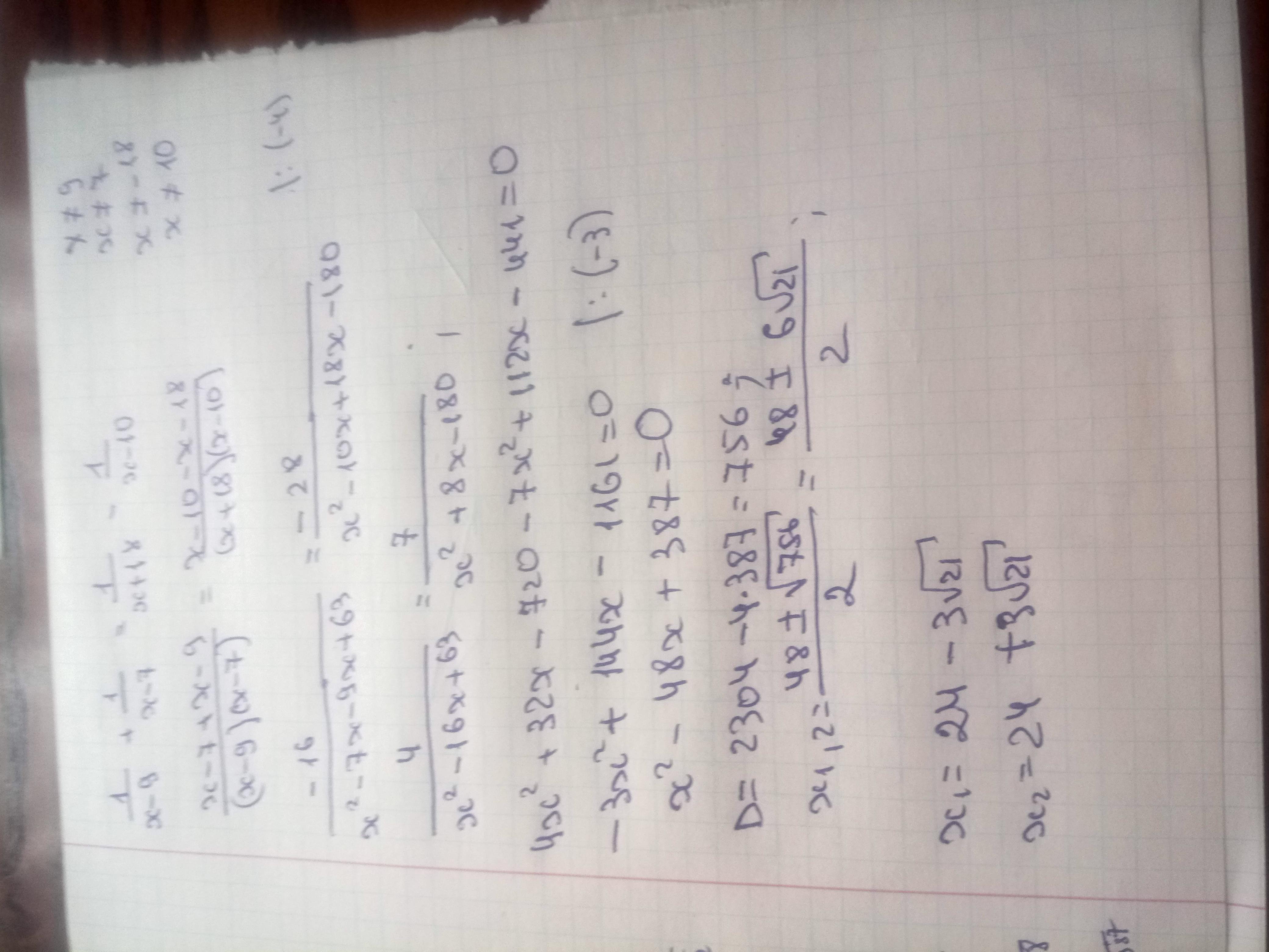 1/(x-9) + 1/(x-7) = 1/(x+18) - 1(x-10) или что, не понятная запись