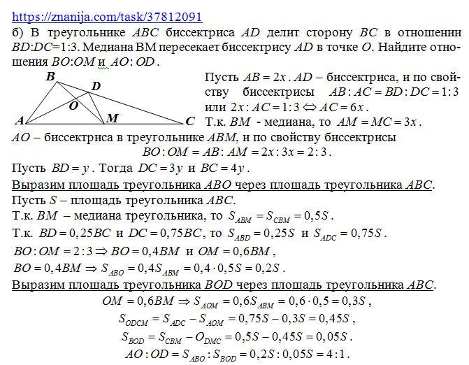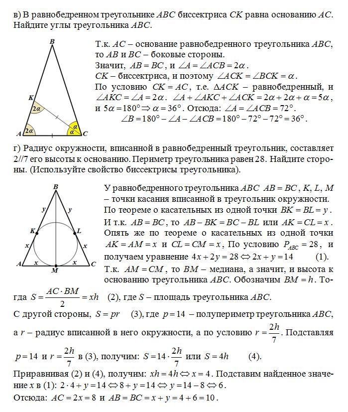 б) В треугольнике `ABC` биссектриса `AD` делит сторону `BC` в отношении `BD:DC=1:3`. Медиана `BM` пересекает биссектрису `AD` в точке `O` Найдите отношения `BO:OM` и `AO:OD`. в) В равнобедренном треугольнике `ABC` биссектриса `CK` равна основанию `AC`. Найдите углы треугольника `ABC`. г) Радиус окружности, вписанной в равнобедренный треугольник, составляет `2//7` его высоты к основанию. Периметр треугольника равен `28`. Найдите стороны. (Используйте свойство биссектрисы треугольника).