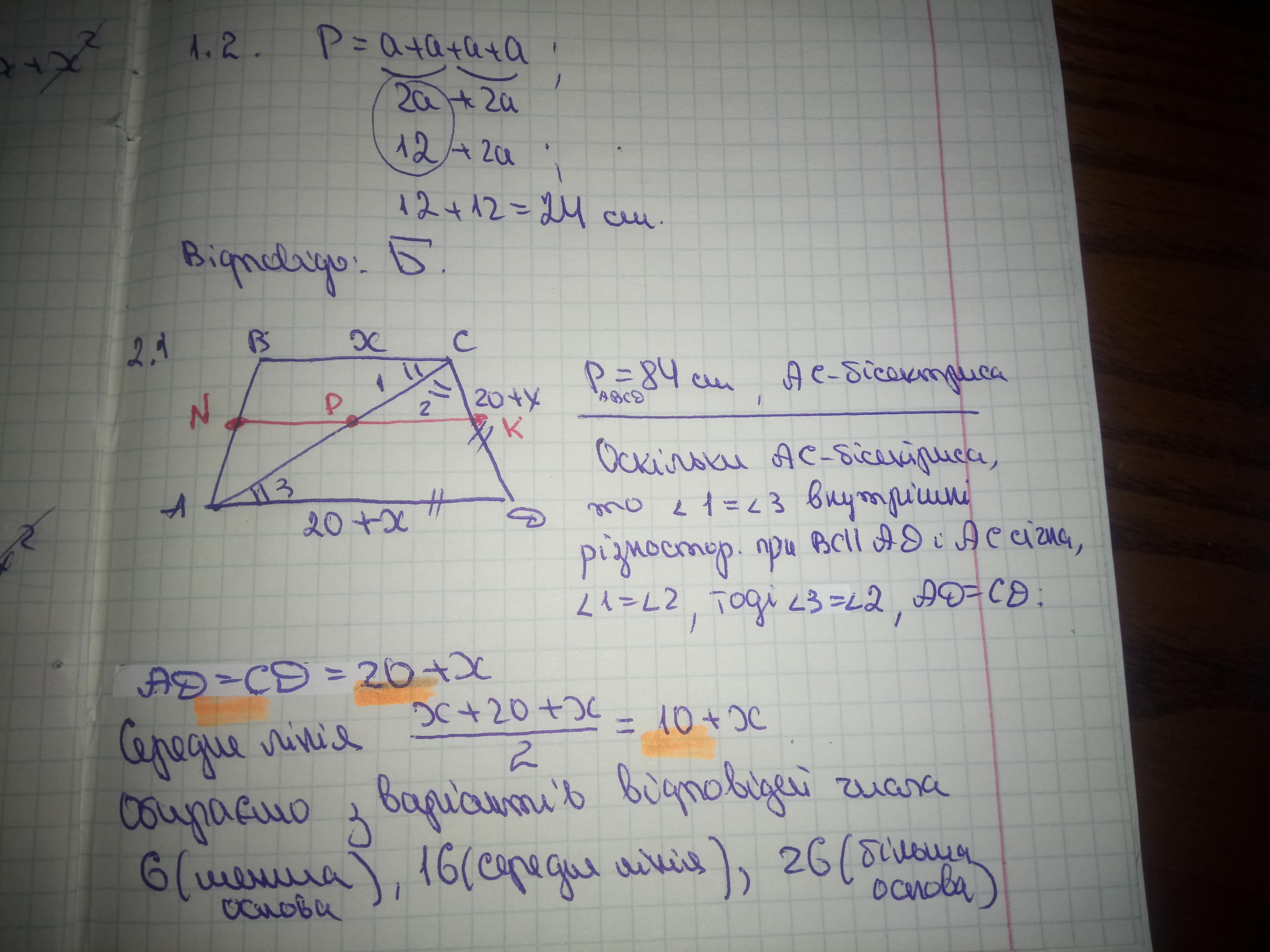 2.1 . Дивимось на відповіді і розуміємо, що окрім 26 см та 6 см- варіантів для більшої і м еншої сторін нема, тоді розраховуємо середню лінію: (6+26)/2=32/2=16 см, і що лишилось- то висота.