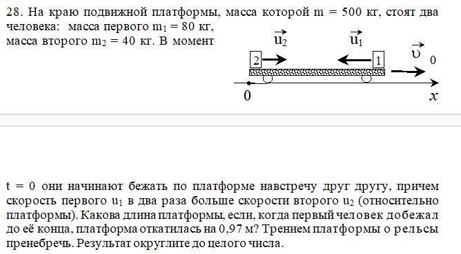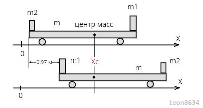 Центра масс самой тележки находится строго по её центру, а центр масс тележки с людьми оказывается смещенным относительно ее центра на метра в сторону более тяжелого человека. Если через центр масс системы пропустить ось вращения и приподнять, то она останется в покое, запишем правило моментов для этого случая, обозначив длину тележки за L