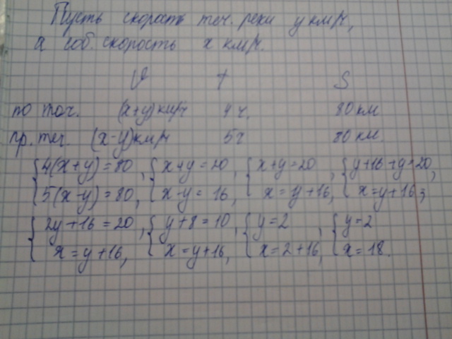 системы двух линейных уравнений с двумя переменными как математические модели реальных ситуаций. КАК РЕШИТЬ? Расстояние между двумя пунктами по реке равно 80км.Это расстояние лодка проплывает по течению реки за 4 ч а против 5 ч. НАйдите собстевнную скорость лодки и скорость течения реки