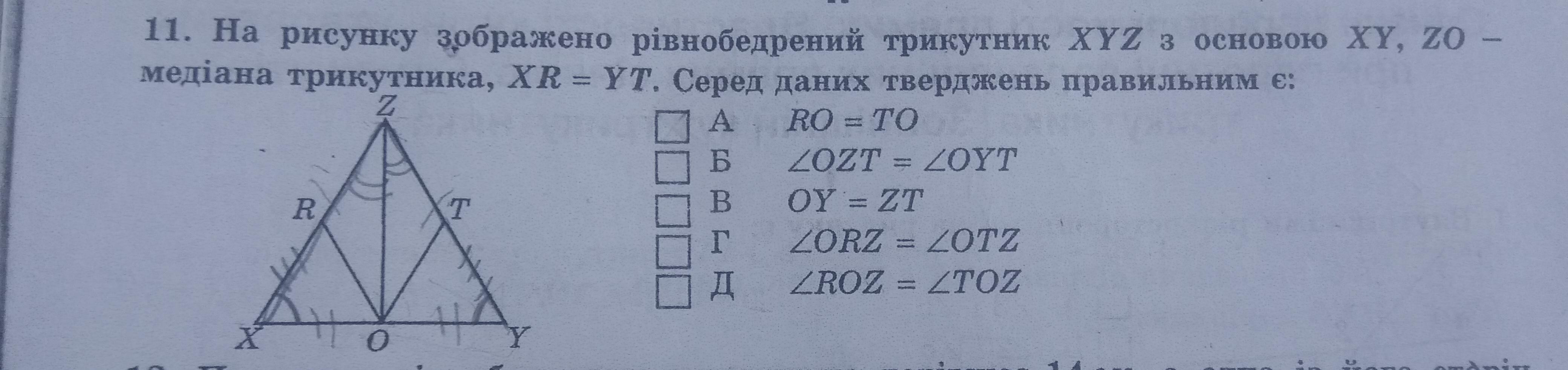 На рисунке изображён равнобедренный треугольник, поэтому медиана ZO также является биссектрисой и высотой. На рисунке также показано, что угол Z делится медианой пополам, а также боковые стороны ХZ и ZY равны. По условиям XR=TY, значит RZ= ZT, и RO=TO. Следовательно ∆RZO=∆TZO, а следовательно их углы также равны. Поэтому в ответах верны следующие варианты: