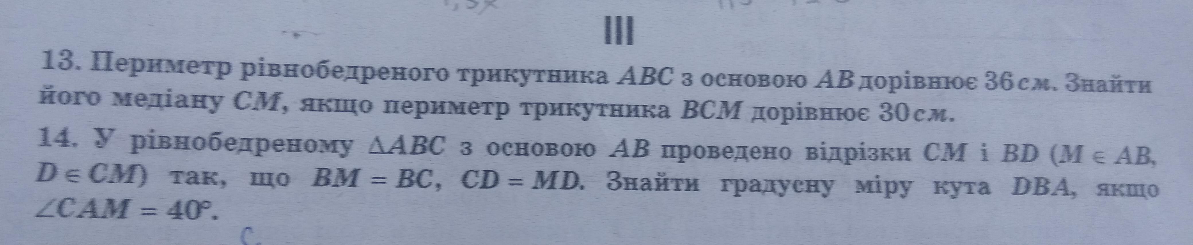 Если периметр ∆АВС=36см, а периметр ∆ВСМ=30см, то медина СМ=36–30=6см.