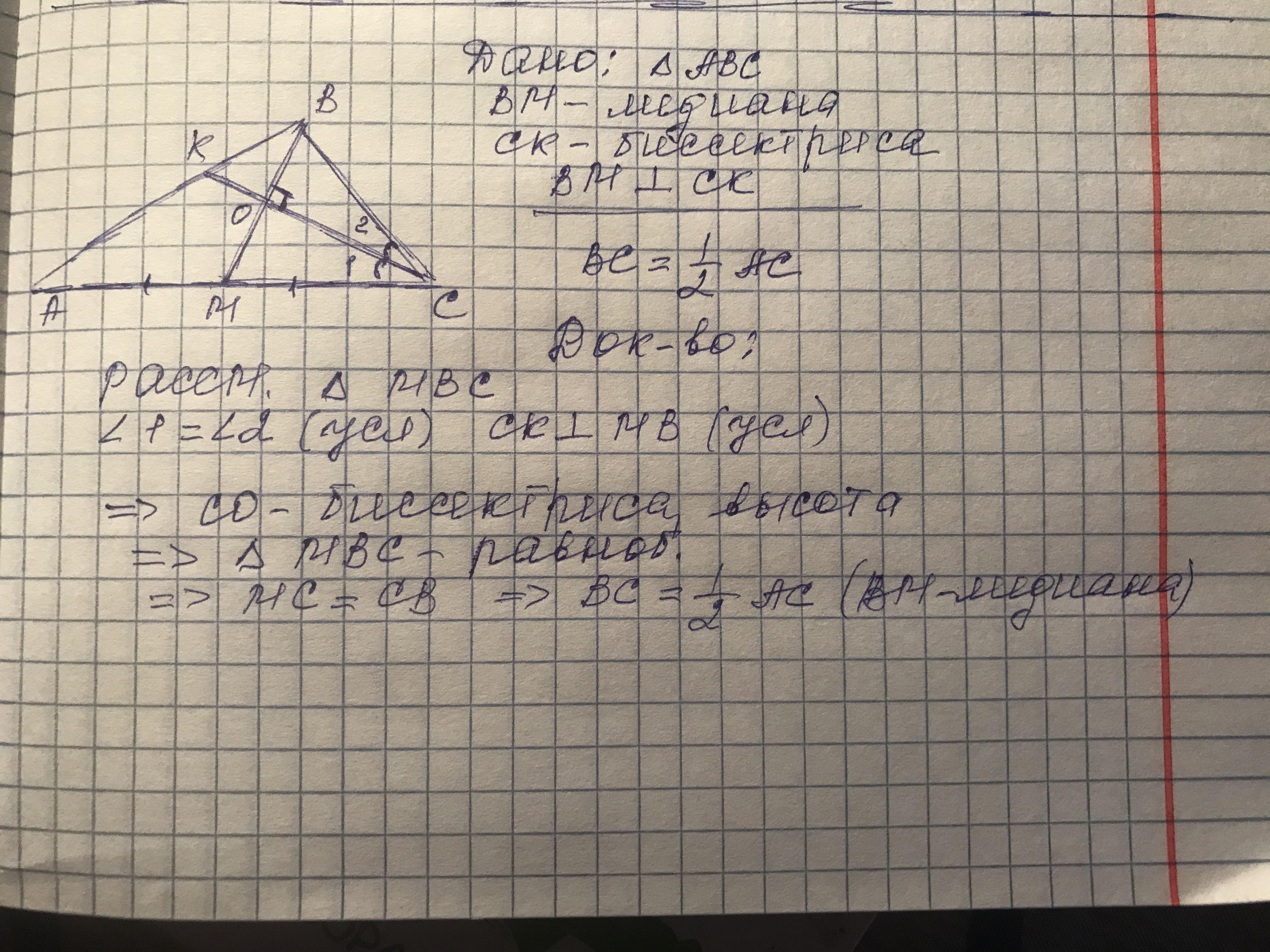 Треугольнике одна из медиан перпендикулярна одной из биссектриса докажите что одна из сторон треугольника вдвое больше другой. Плиз помогите