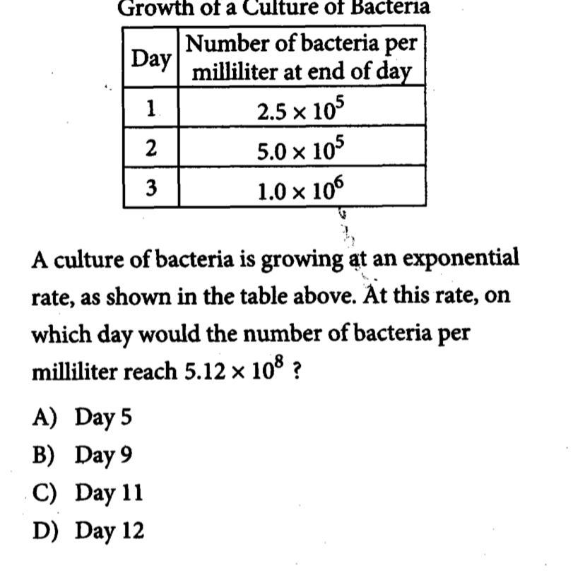 Культура бактерий растет экспоненциально, как показано в таблице выше. При такой скорости, в какой день число бактерий на миллилитр достигнет 5,12 × 10?