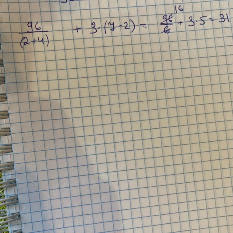 сумма частного числа 96 и сумма чисел 2 и 4 и произведение числа 3 и разности чисел 7 и 2
