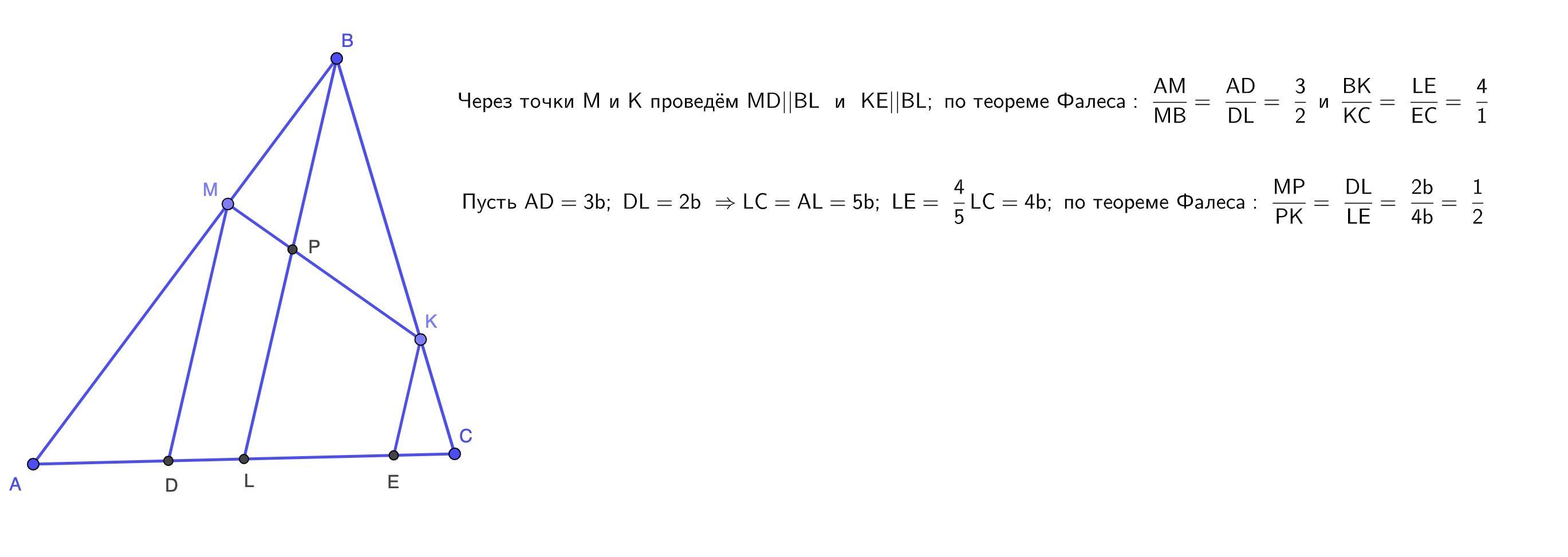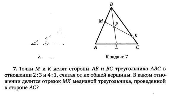 точки м и к делят стороны ab и bc треугольника аbc в отношении 2:3 и 4:1 от их общей вершины в каком отношении делится отрезок m k медианы треугольника проведённой к стороне ac