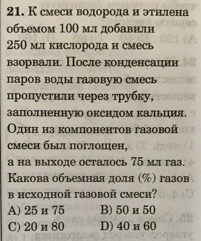21. К смеси водорода и этилена объемом 100 мл добавили 250 мл кислорода и смесь взорвали. После конденсации паров воды газовую смесь пропустили через трубку, заполненную оксидом кальция, один из компонентов газовой смеси был поглощен, а на выходе осталось 75 мл газа. Какова объемная доля газов в исходной газовой смеси?