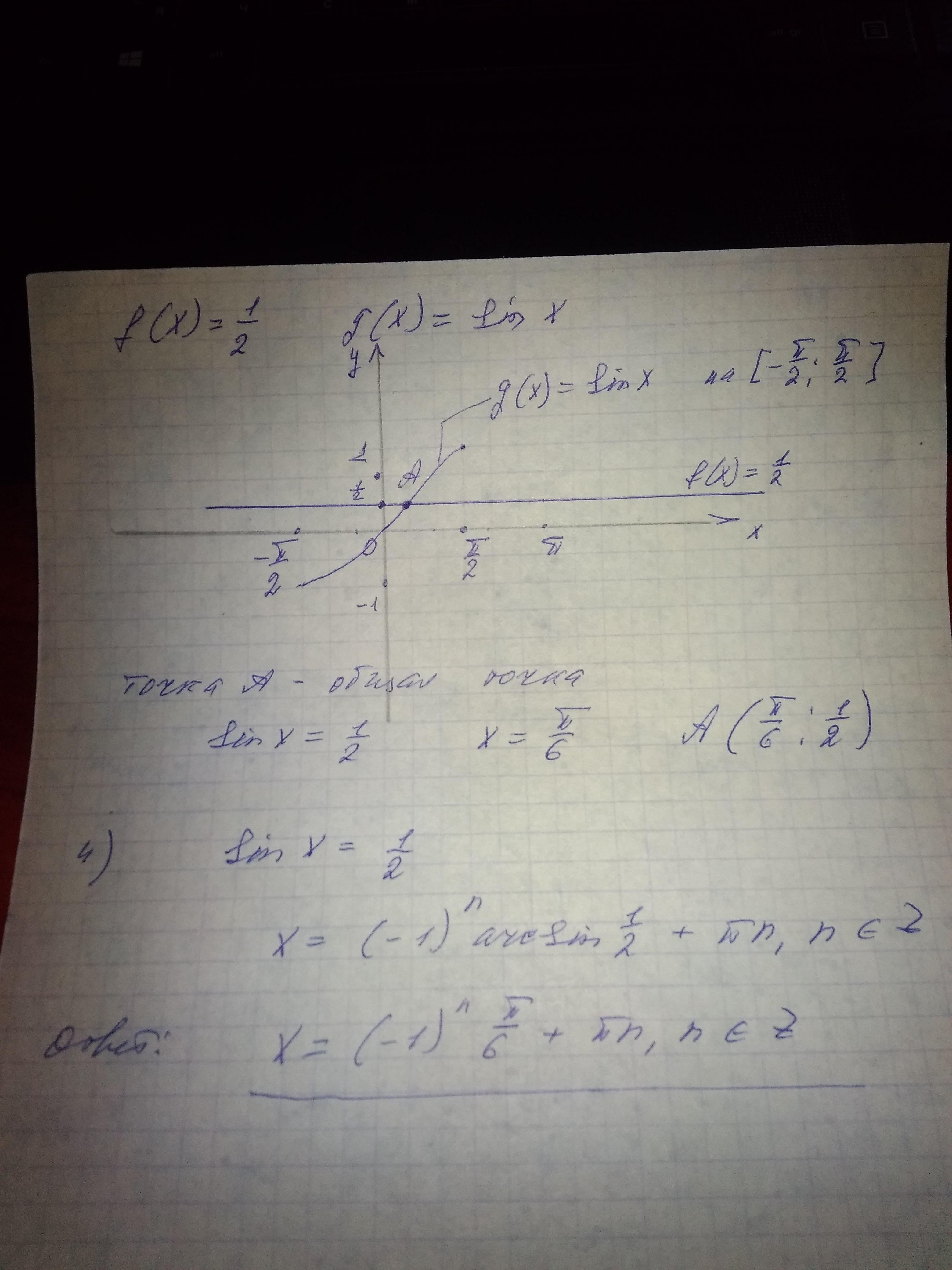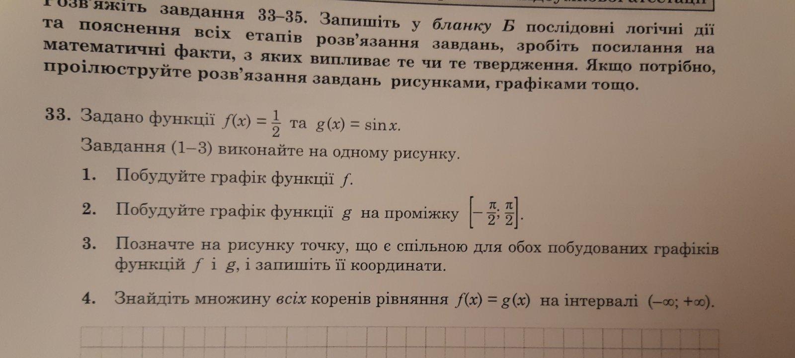 Да, 1) нарисовать график f, 2)нарисовать график g на промежутке [-π\2; π\2], 3) подписать общую точку и найти её координаты, 4) найти множину всех кореней уравнения f(x)=g(x) на интервале (-∞;+∞)