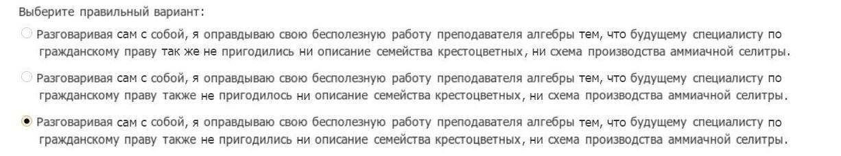 1) Разговаривая сам с собой, я оправдываю свою бесполезную работу преподавателя алгебры тем, что будущему специалисту по гражданскому праву так же не пригодились ни описание семейства крестоцветных, ни схема производства аммиачной селитры.