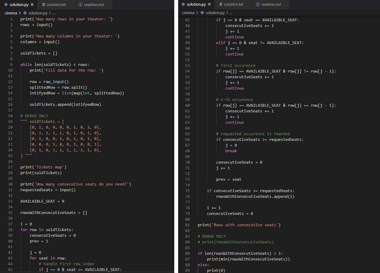 В кинотеатре n рядов по m мест в каждом. В двумерном массиве хранится информация о проданных билетах, число 1 означает, что билет на данное место уже продан, число 0 означает, что место свободно. Поступил запрос на продажу k билетов на соседние места в одном ряду. Определите, можно ли выполнить такой запрос.