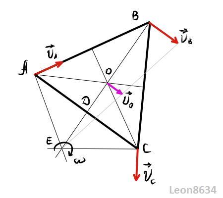 они пересекутся в точке Е, это и есть мгновенный центр скоростей, вся фигура вращается вокруг него с некоторой угловой скоростью ω. Найдем эту угловую скорость. Определим длину радиус вектора точки А - отрезка АЕ. Заметим, что угол ВАЕ - прямой, а угол ВАС при вершине треугольника 60°, таким образом, угол САЕ равен 30°. Из прямоугольного треугольника DAE имеем:
