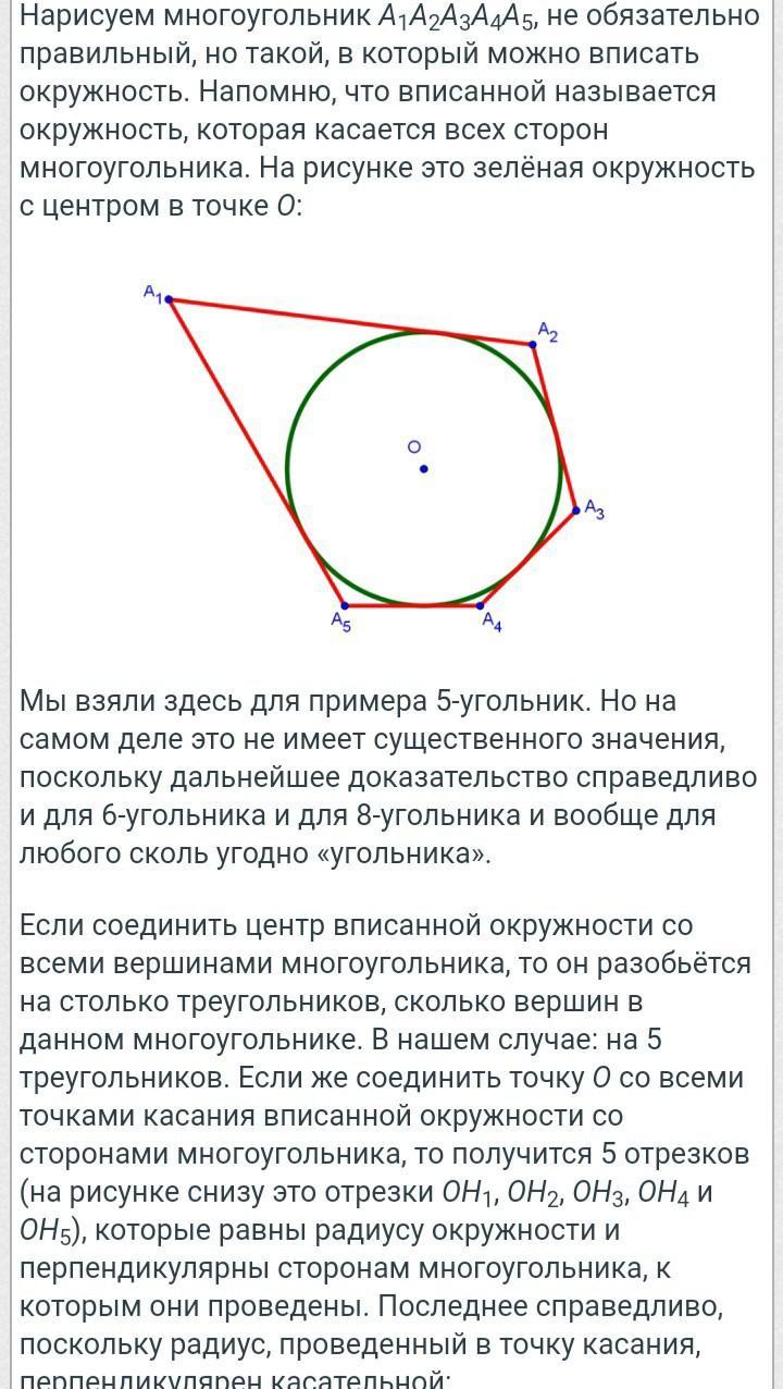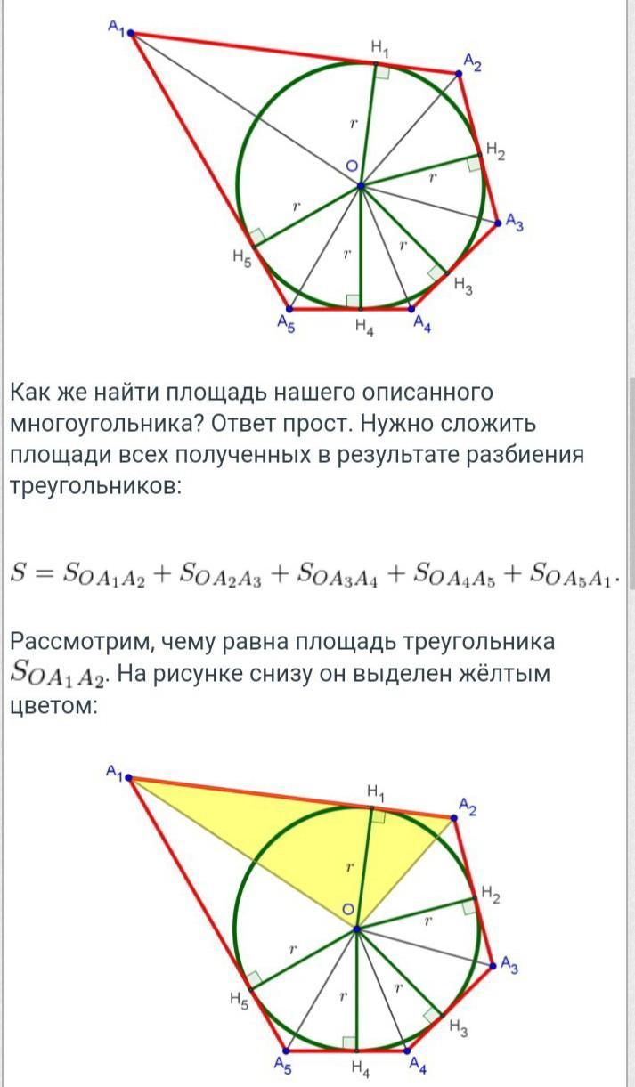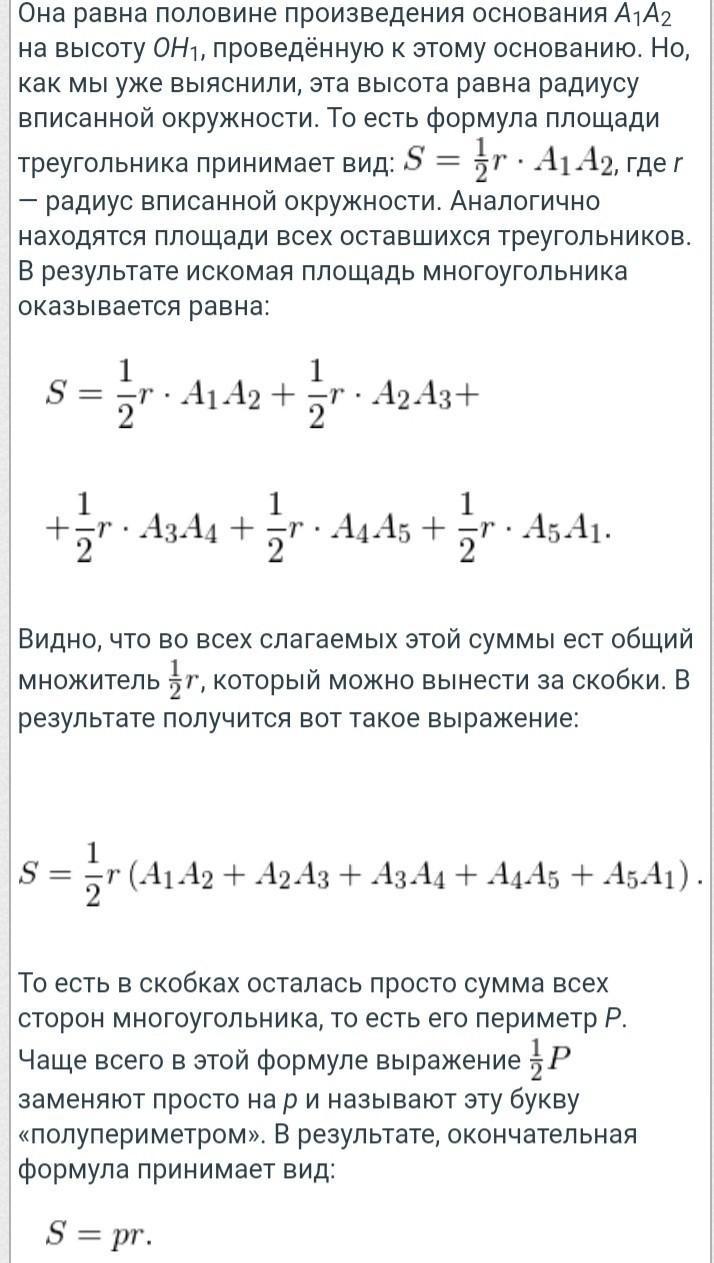 Отметит напоследок, что в треугольник, который является частным случаем многоугольника, всегда можно вписать окружность. Поэтому для треугольника эту формулу можно применять всегда. Для остальных многоугольников, с количеством сторон большим 3, сперва нужно убедиться, что в них можно вписать окружность. Если это так, можно смело использовать эту простую формулу и находить по ней площадь этого многоугольника.