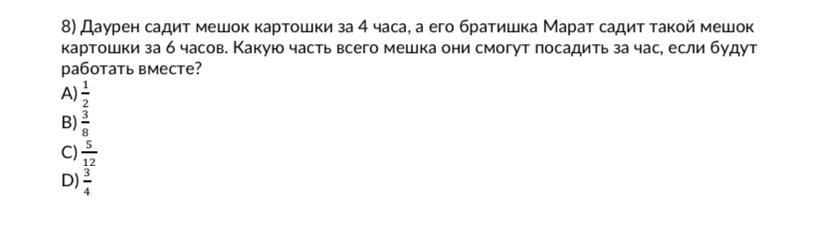 Даурен садит мешок картошки за 4 часа, а его братишка Марат садит такой мешок картошки за 6 часов. Какую часть всего мешка они смогут посадить за час, если будут работать вместе?