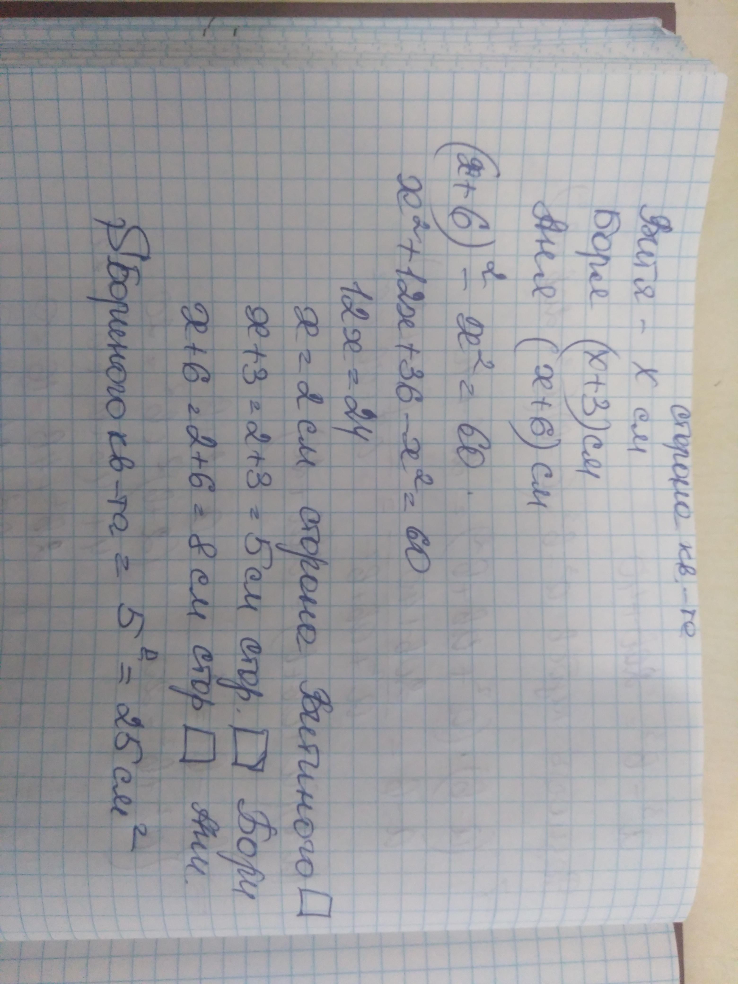(х+3-х+3)(х+3+х-3)=60; 6*2х=60; х=60/12=5, сторона Бориного квадрата 5см, значит, площадь 5*5=25/см²/