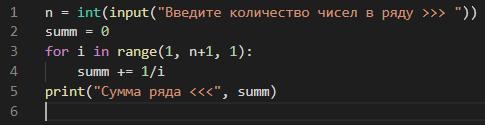 Написать программу, которая вычисляет сумму первых n членов ряда: 1+1/2+1/3+… Количество суммируемых членов ряда вводит пользователь на python используя циклы for и т.п