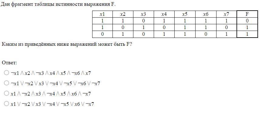 Вот как выглядит решение. Поставляем значения из таблицы истинности в варианты функций. Та функция, результат которой совпадает с результатом из таблицы, является ответом. В данном случае это номер 2
