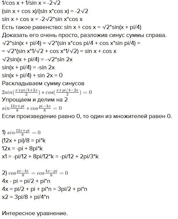 Помогите с тригонометрией. Здравствуйте, на просторах знания.ком случайно нашел вопрос, который очень заинтересовал меня. Вот он: "1/cosx+1/sinx=-2корня из 2. Не решается вообще. Нужна помощь". Я прорешал его сам и у меня получился ответ: x=pi/4+pi*n, Где n целое число, но в ответах оказался совсем другой ответ, да и решение(Фото прилагается). Почему автор не учитывает ОДЗ, а именно cosx не равно нулю и sinx не равно нулю? Тогда получается что его ответ неверный. Вот собственно мое решение(Как по мне наиболее простое и лаконичное. Если я не прав пожалуйста укажите ошибки в моих размышлениях). Решение: 1) 1/sinx+1/cosx=-2корня из 2 2)cosx+sinx/sinx*cosx=-2корня из 2 3)Запишем ОДЗ, что синус и косинус не равны нулю и перемножим на них обе части 4)Получилось: sinx+cosx=-2корня из 2*sinx*cosx 5)Возведем обе части в квадрат: sin^2x+2sinx*cosx+cos^2x=8cos^2x*sin^2x 6) Сумма квадратов равна 1, а по формуле двойного угла синуса получаем: 1+2sinxcosx=2sin2x => 1+sin2x-2sin2x=0 В итоге sin2x=1 и ответ который я написал выше. Повторяю, если я не прав то распишите почему мое решение неверное. Спасибо.