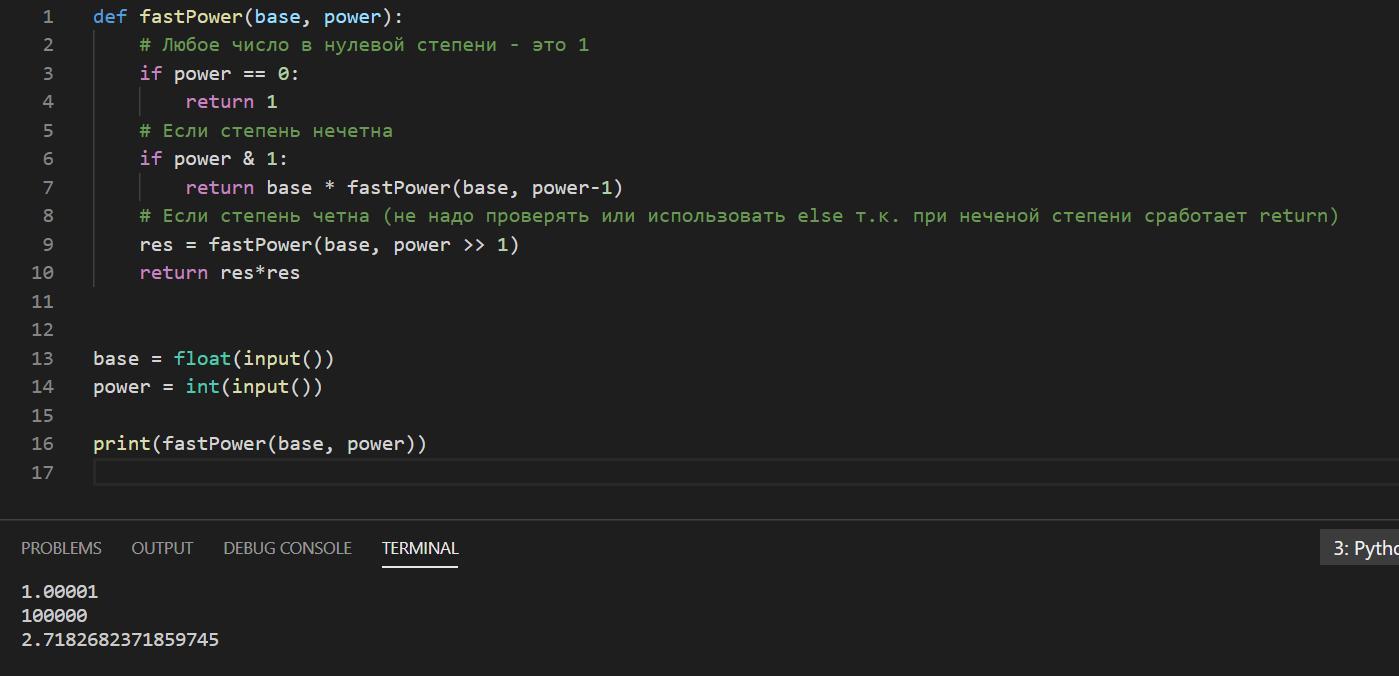 СРОЧНО!!! НА ПИТОНЕ!!! ДАЮ 55 БАЛЛОВ!!! Быстрое возведение в степень Возводить в степень можно гораздо быстрее, чем за n умножений! Для этого нужно воспользоваться следующими рекуррентными соотношениями: an=(a2)n/2 при чётном n, an=a∗an−1 при нечётном n. Реализуйте алгоритм быстрого возведения в степень. Если вы всё сделаете правильно, то количество умножений будет иметь порядок log2n. Нельзя использовать операцию возведения в степень. Входные данные Вводится действительное число a и целое неотрицательное число n. Выходные данные Выведите ответ на задачу. Примеры Ввод 2 7 Вывод 128 Ввод 1.00001 100000 Вывод 2.71827