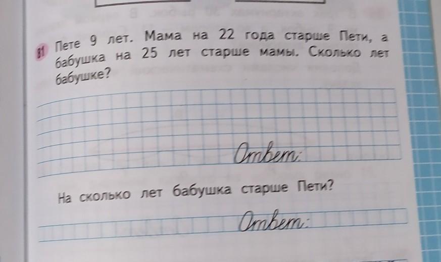 2) 56-9 = 47 лет - бабушка старше Пети;