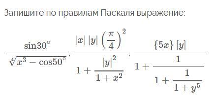 1. (sin(30*(pi/180)))/(power((sqr(x)*x)-cos(50*(pi/180))), 1/4));