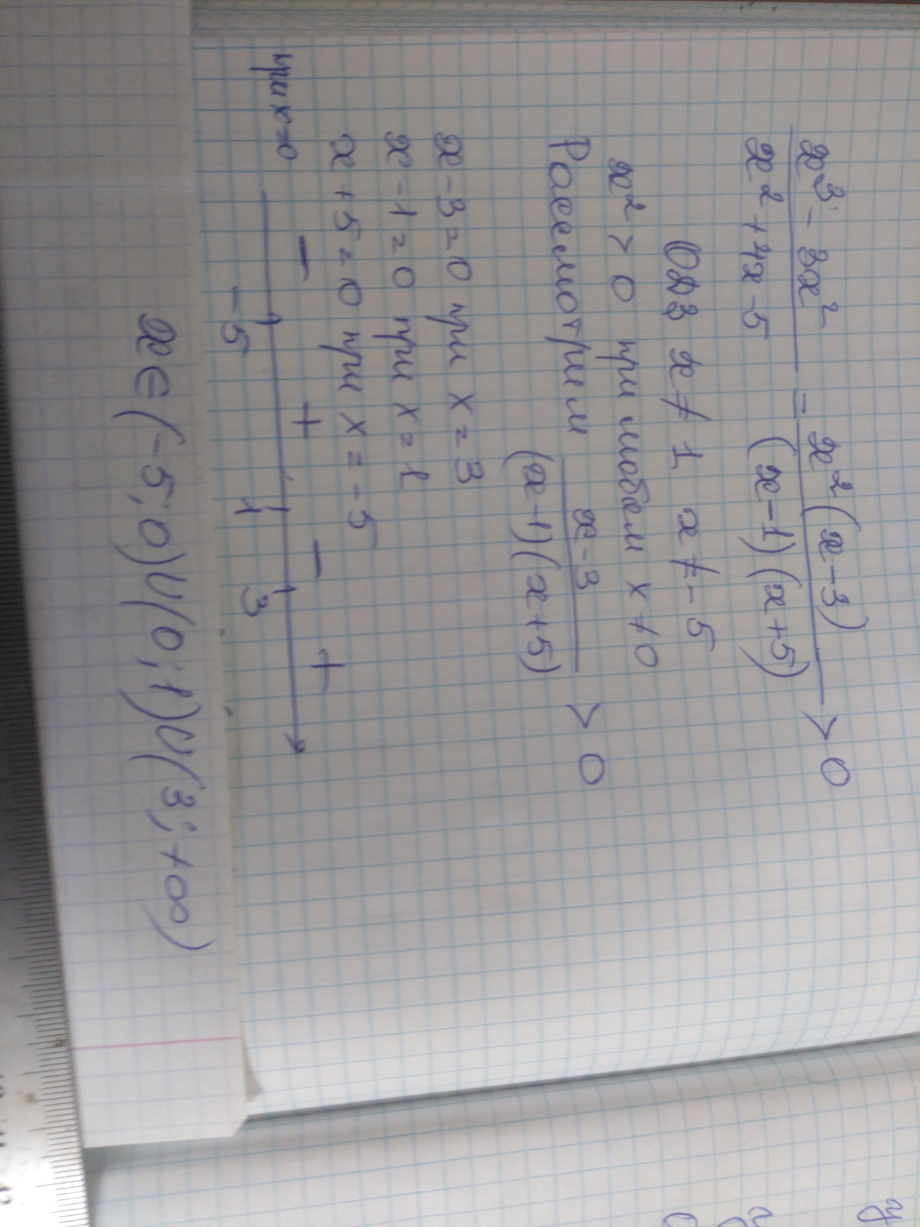 нужно решить неравенство (x³-3x²)/(x²+4x-5 )=х²(х-3)/((х+5)*(х-1))>0