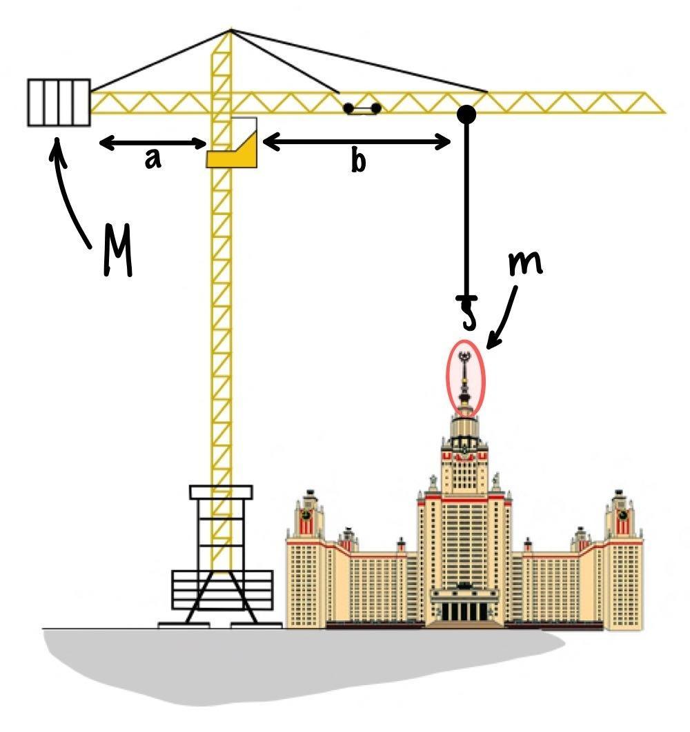Определи минимальную массу перегруза, которую нужно установить слева на кране, чтобы он не свалился при поднятии шпиля, масса которого 120 тонн. Расстояния a и b соответственно 20 и 50 метров.