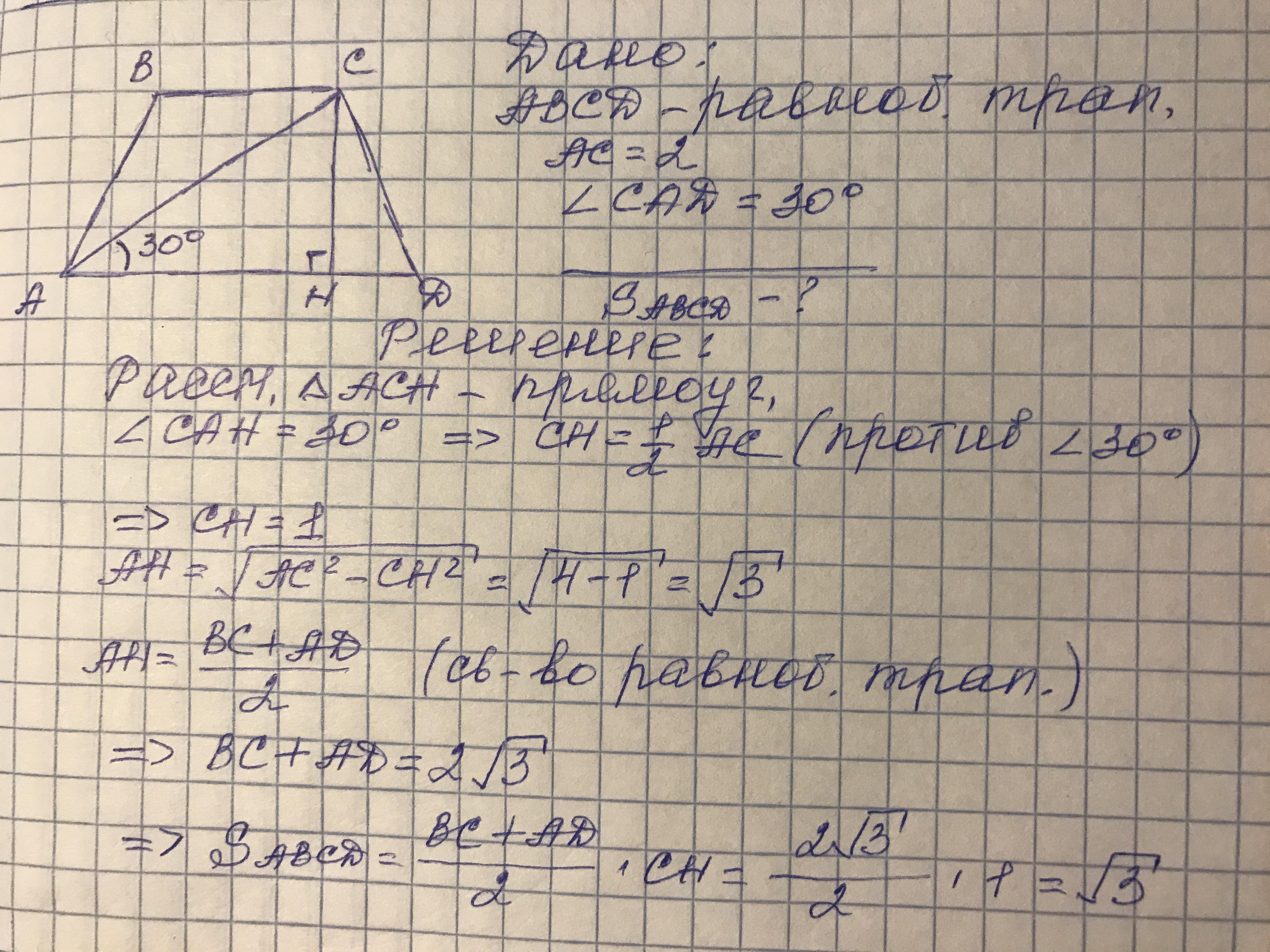 Проведем высоту трапеции CH. Получили прямоугольный треугольник ACH. Катет, лежащий против угла в 30° в прямоугольном треугольнике равен половине гипотенузы. Тогда CH=1. По теореме Пифагора . Проведем высоту трапеции BK. ΔABK=ΔCDH, т.к. AB=CD (трапеция равнобедренная по условию) и BK=CH (высоты одной трапеции). Значит