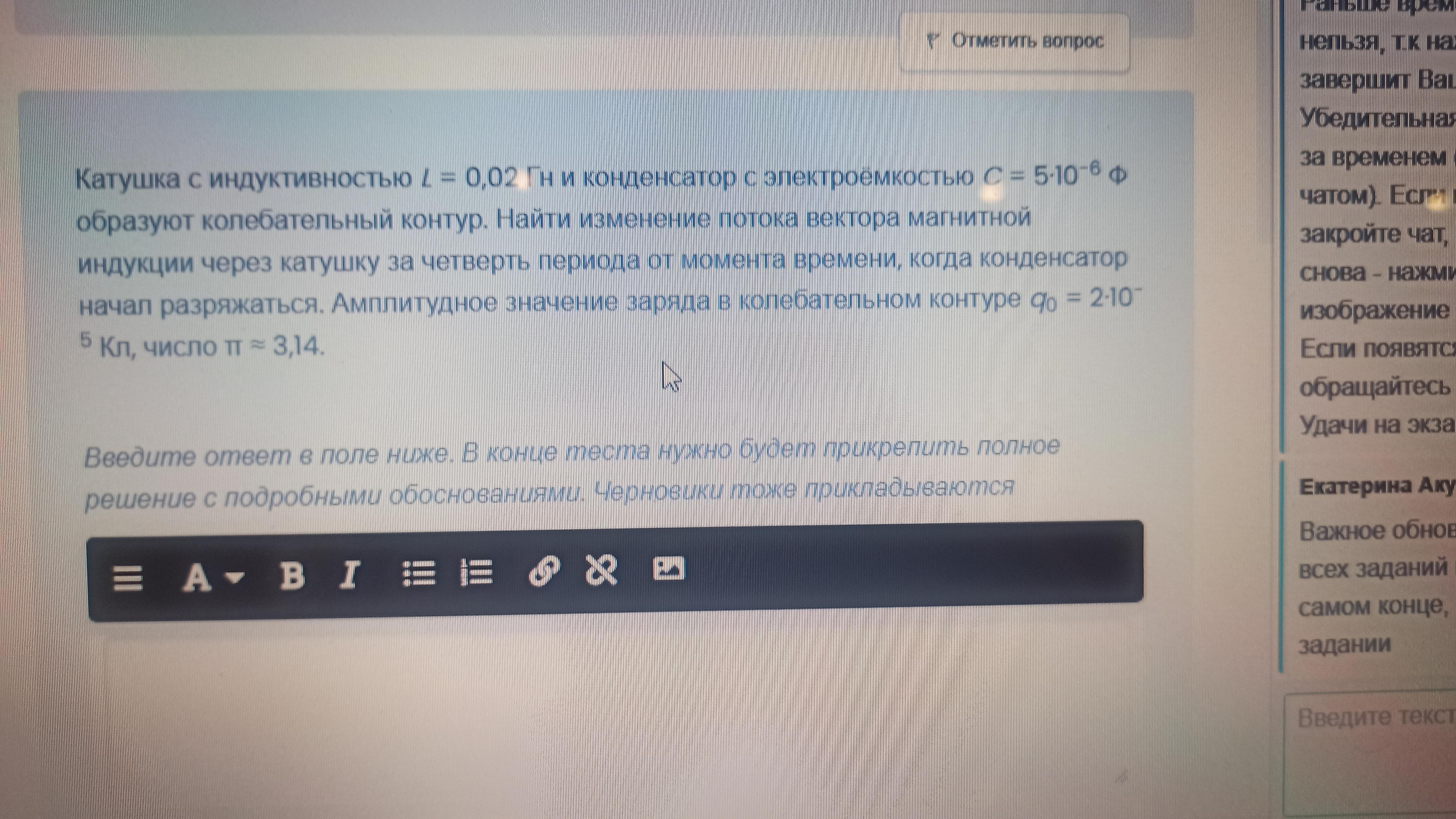 5 Катушка с индуктивностью L=0,02 Гн и конденсатор с электроёмкостью C=5*10^-6 ф образуют колебательный контур. Найти изменение потока вектора магнитной индукции через катушку за четверть периода от момента времени, когда конденсатор начал разряжаться. Амплитудное значение заряда в колебатнльном контуре q0=2*10^-5 Кл, число П =(примерно равно) 3,14