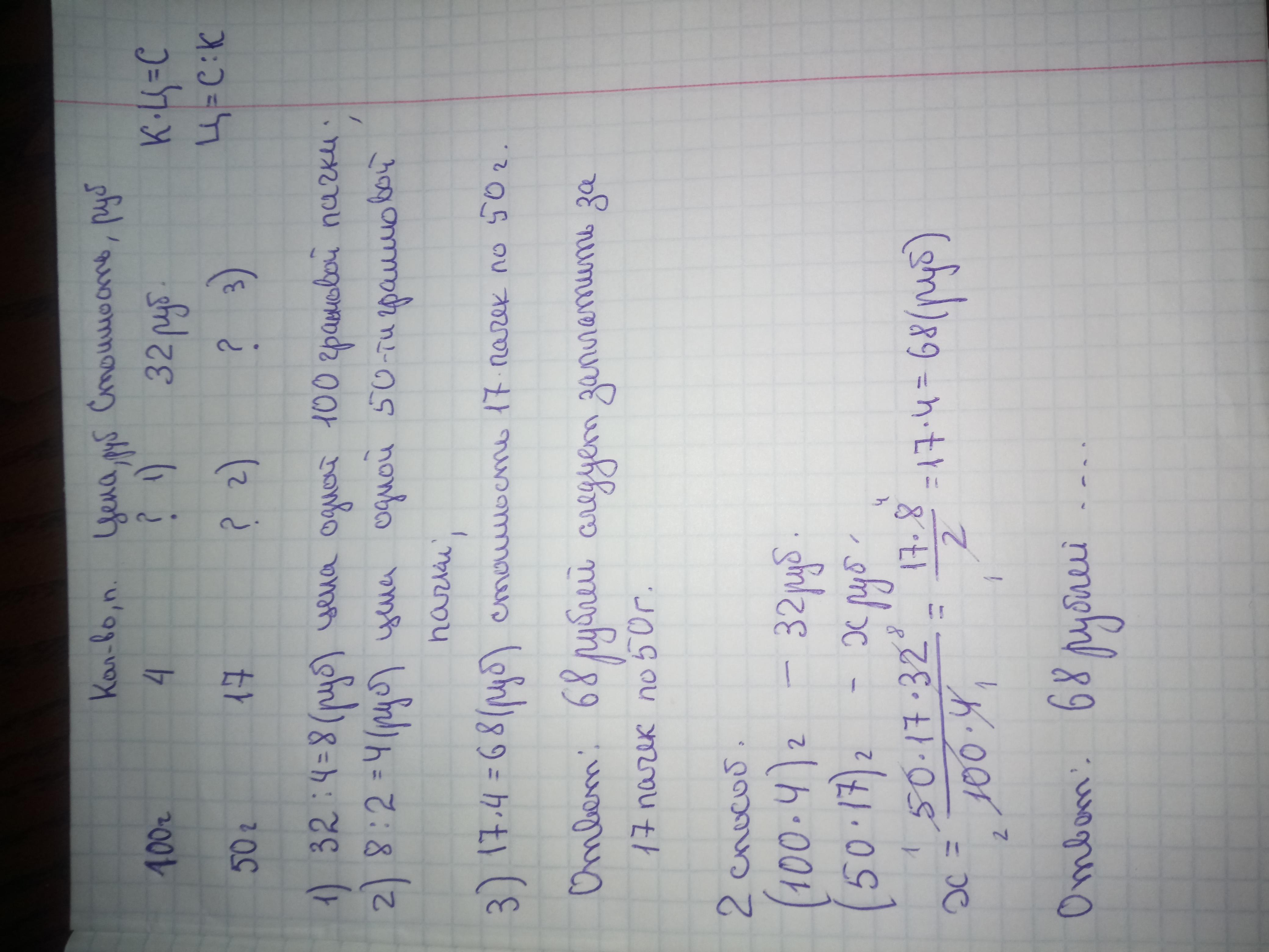 помогити решить задачю 5.За 4 пачки чая по 100 г в каждой заплатили 32 рубля. Сколько следует заплатить за 17 пачек того же чая по 50 г?