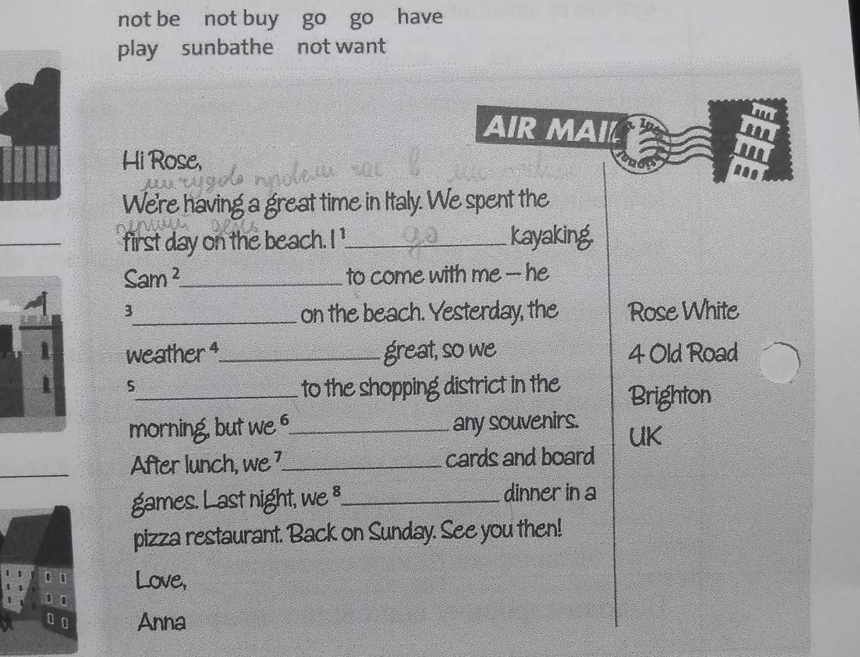 МИ чудово проводимо час в Італії. Перший день ми провели час на пляжію. Я ходжу на каяк. Сем не хоче іти зі мною - він загаряє на пляжію Вчора погода була не дуже гарною, тому ми пішли на торговий райончик з ранку але не купляли ніяких сувенірів. Після обіду ми грали в карти та на дошці ігрию Останню ніч ми вечеряли в ресторані.ПОВЕРНУСЯ В НЕДІЛЮ. До зустрічі.