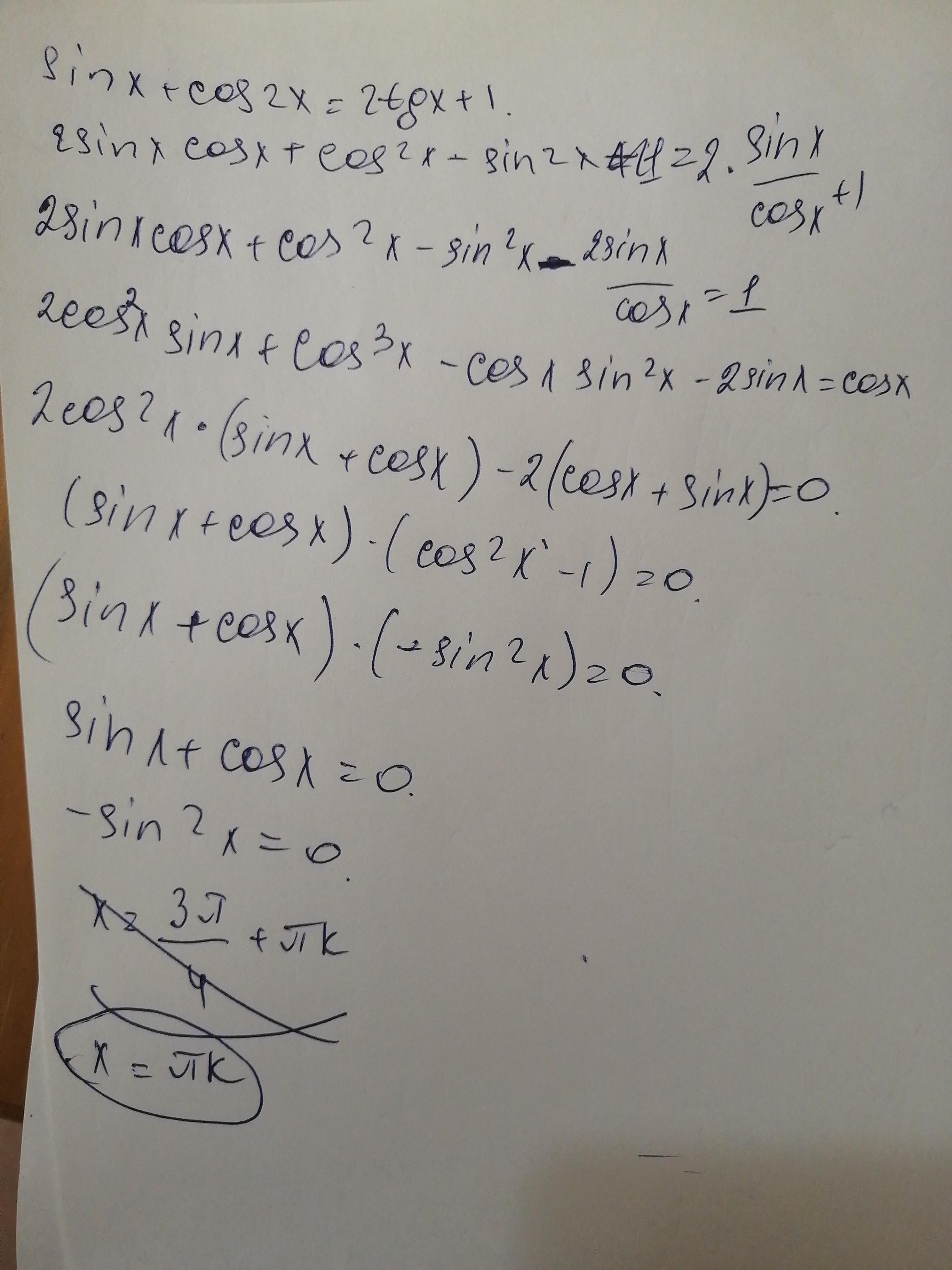 Найдите число корней уравнения: sin2x+cos2x=2tgx+1 на промежутке [0;2pi]