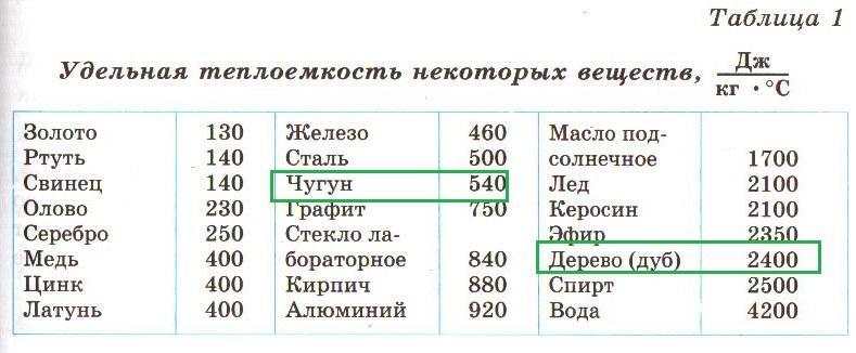 Найди по таблице материал, у которого теплоёмкость в пять раз меньше, чем у чугуна. Он тебе и нужен.