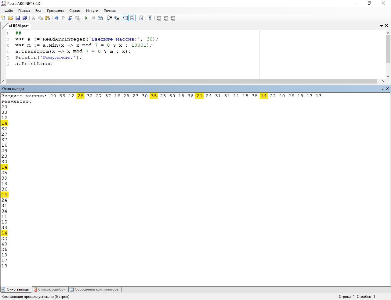Дан целочисленный массив из 30 элементов. Элементы массива могут принимать натуральные значения от 1 до 10 000 включительно. Опишите на одном из языков программирования алгоритм, который находит минимум среди элементов массива, делящихся нацело на 7, а затем заменяет каждый элемент, делящийся нацело на 7, на число, равное найденному минимум. Гарантируется, что хотя бы один такой элемент в массиве есть. В качестве результата необходимо вывести изменённый массив, каждый элемент выводится с новой строчки.