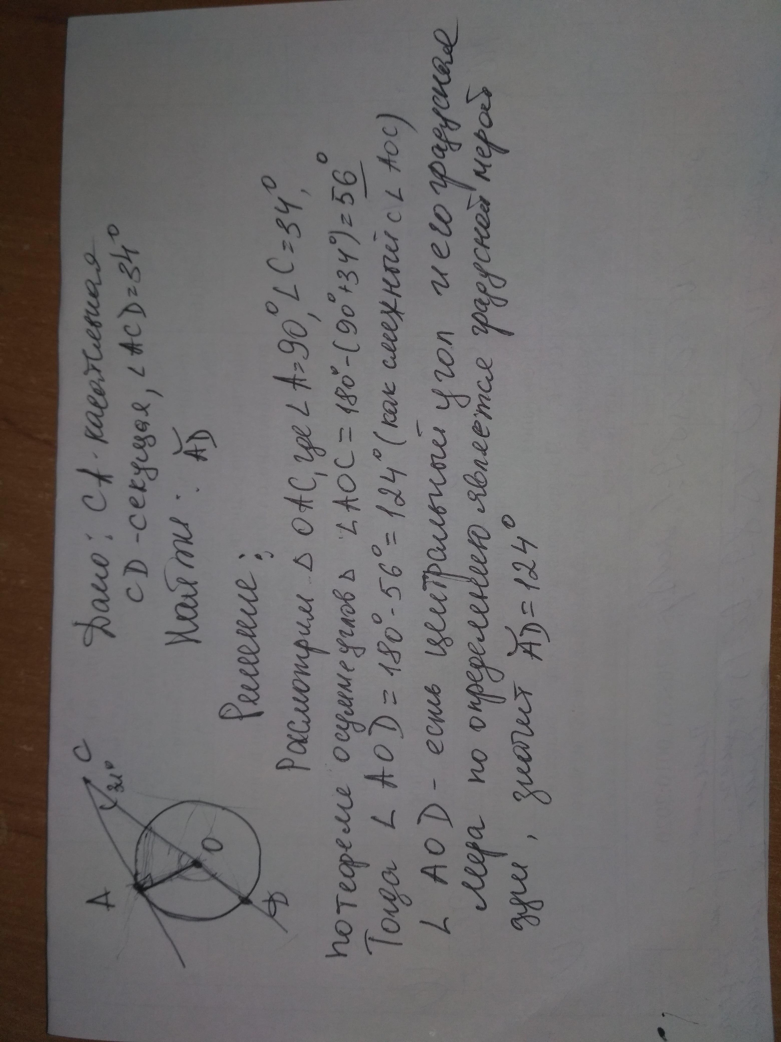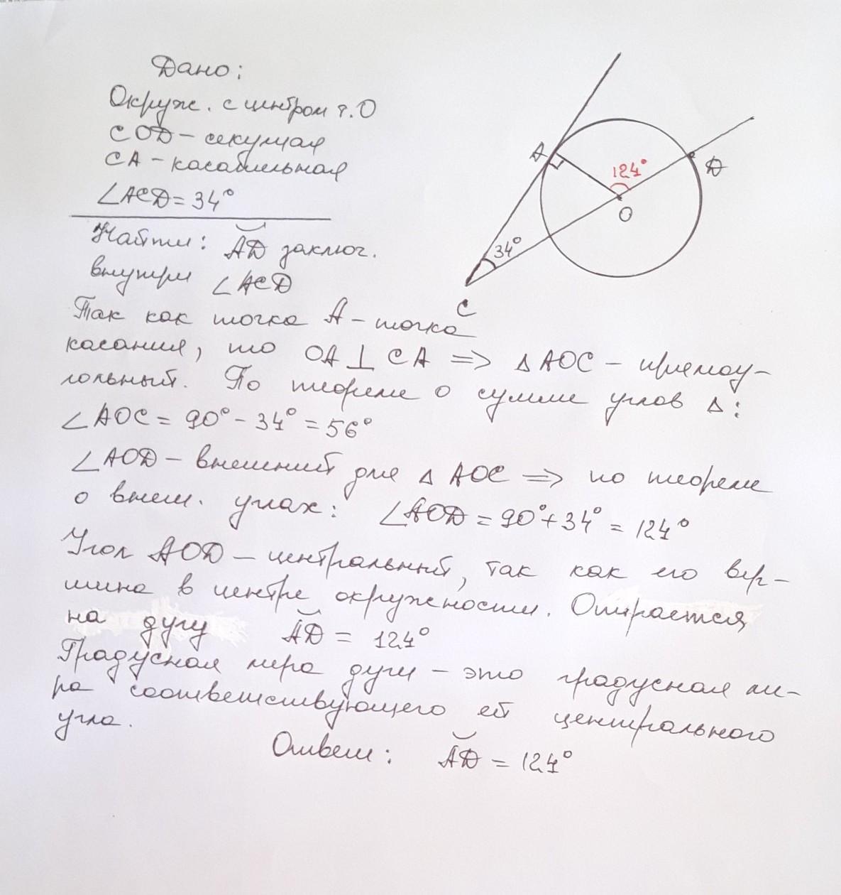 14. К окружности с центром в точке О проведены из точки С касательная СА и секущая СОD. Угол АСD равен 34о. Найдите в градусах длину части окружности – дуги АD, заключённой внутри угла АСD