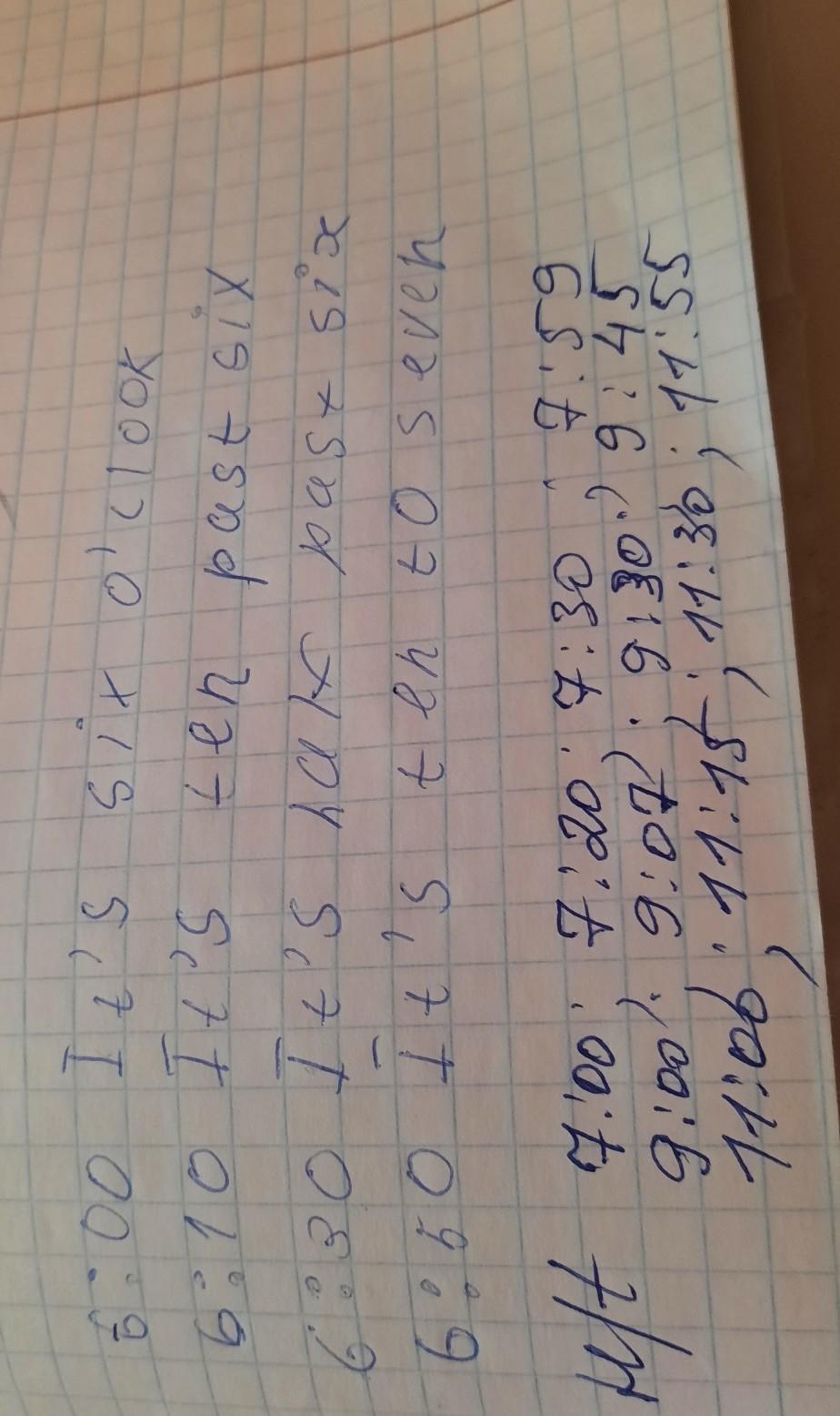 it`s seven o`clock, it`s twenty past seven, it`s half past seven, it`s one to eight, it`s nine o`clock, it`s seven past nine, it`s half past nine, it`s quater to ten, it`s eleven o`clock, it`s quater past eleven, it`s half past eleven, it`s five to twelve.