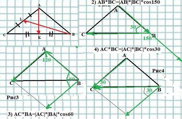 Векторы АК*ВL=0,25(АВ*ВА +АВ*ВС +АС*ВА +АС*ВС) .