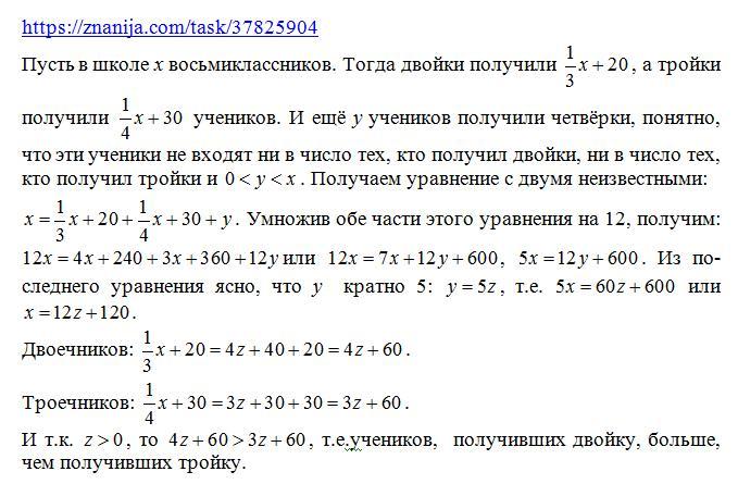 В школе была проведена контрольная по математике для всех восьмиклассников. Треть всех участников и еще 20 учеников получили двойки; четверть участников и еще 30 учеников получили тройки, а некоторые даже получили четверки. Кого оказалось больше: получивших двойку или получивших тройку?