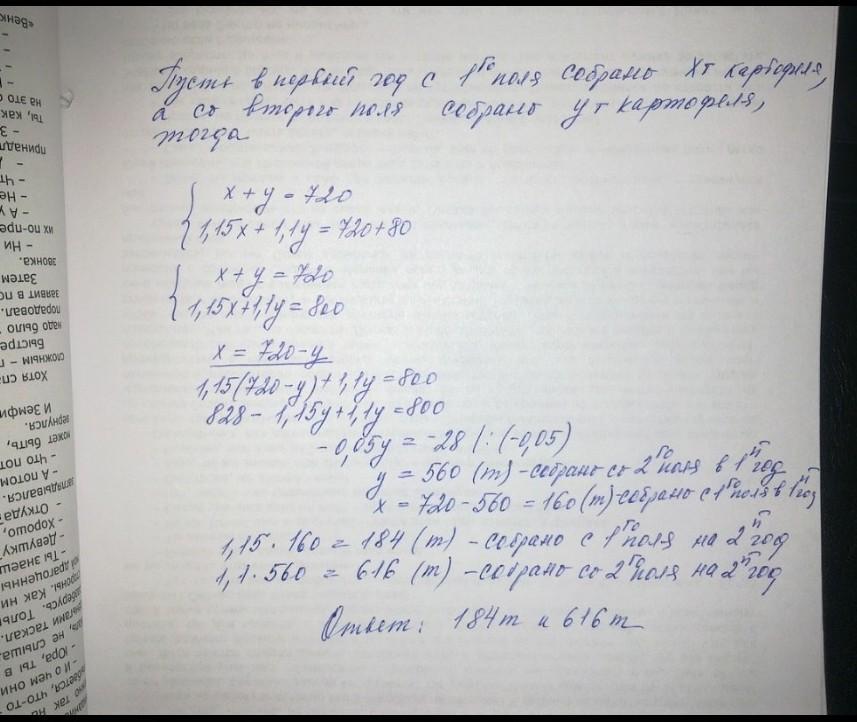 ПОМОГИТИ РЕШИТЬ ЗАДАЧУ Колхоз собрал с двух полей 720 т картофеля. На следующий год на первом поле урожай увеличился на 15%, а на втором на 10%, а потому колхоз собрал с этих полей на 80 т больше картофеля,чем в предыдущем году. Сколько картофеля было собрано с каждого поля в следующем году?