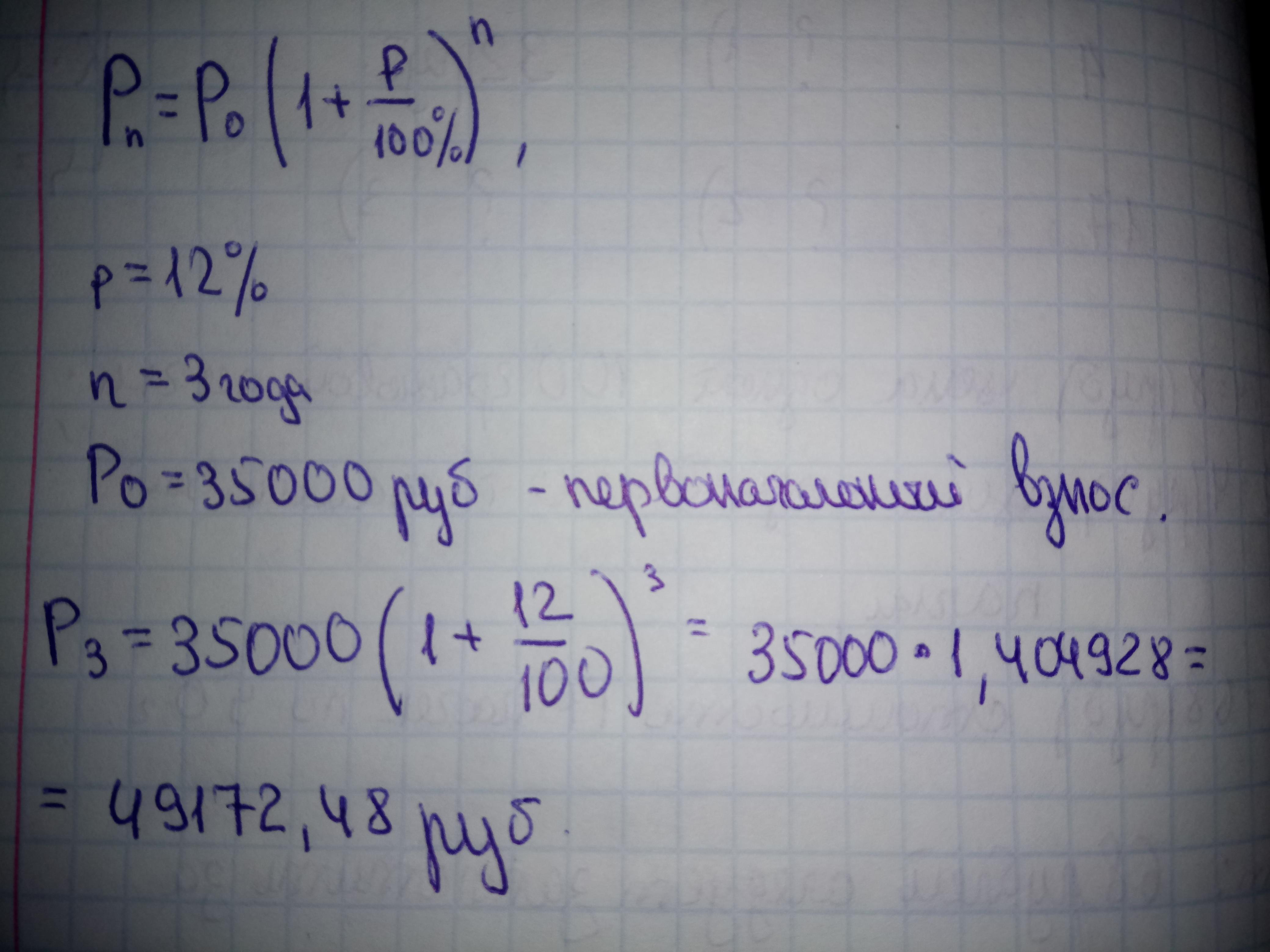Банк выплачивает доходов из расчёта 12% влаженной суммы в год . Сколько денег окажется на счёте через 3 год если на него положили 35000 рублей ? Срочно нужен ответ пж