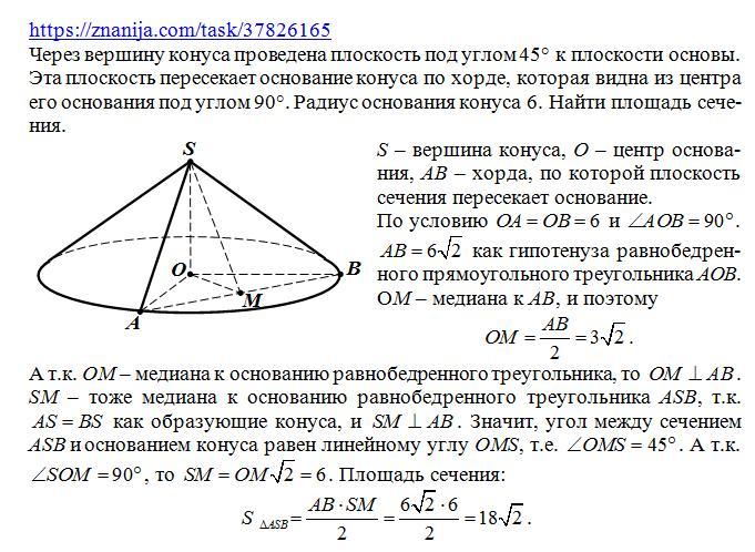 основи. Ця площина перетинає основу конуса по хорді, яку видно з центра його основи під кутом 90°. Радіус основи конуса 6. Знайти площу перерізу.